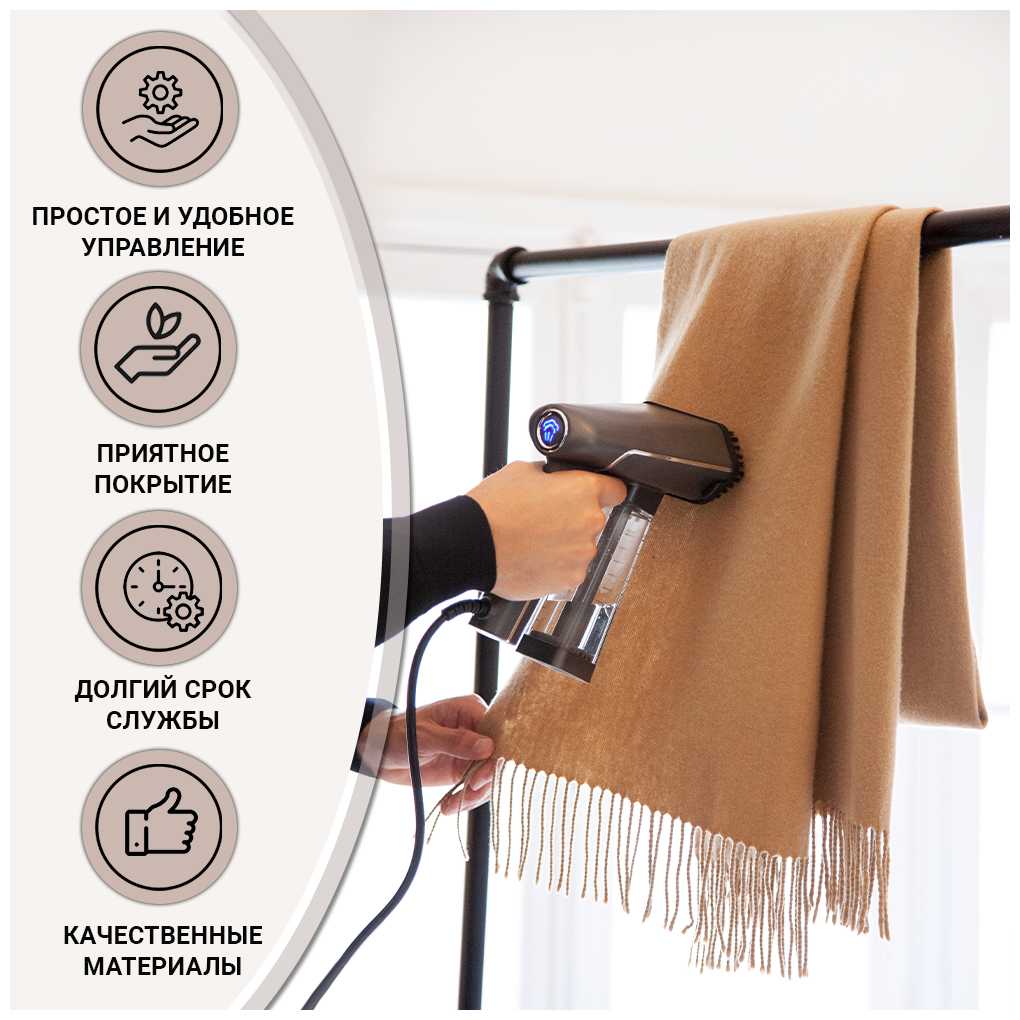 - Удобная конструкция с крючком для подвешивания одежды оптимизирует процесс отпаривания.