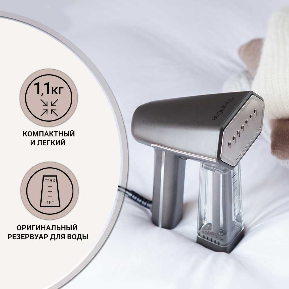 При весе около 1 кг (даже с заполненным резервуаром) отпариватель комфортен для одноручного управления. Пользователи подтверждают, что рука не устает при обработке 5-6 вещей подряд. Эргономичная ручка и балансировка упрощают работу. -
