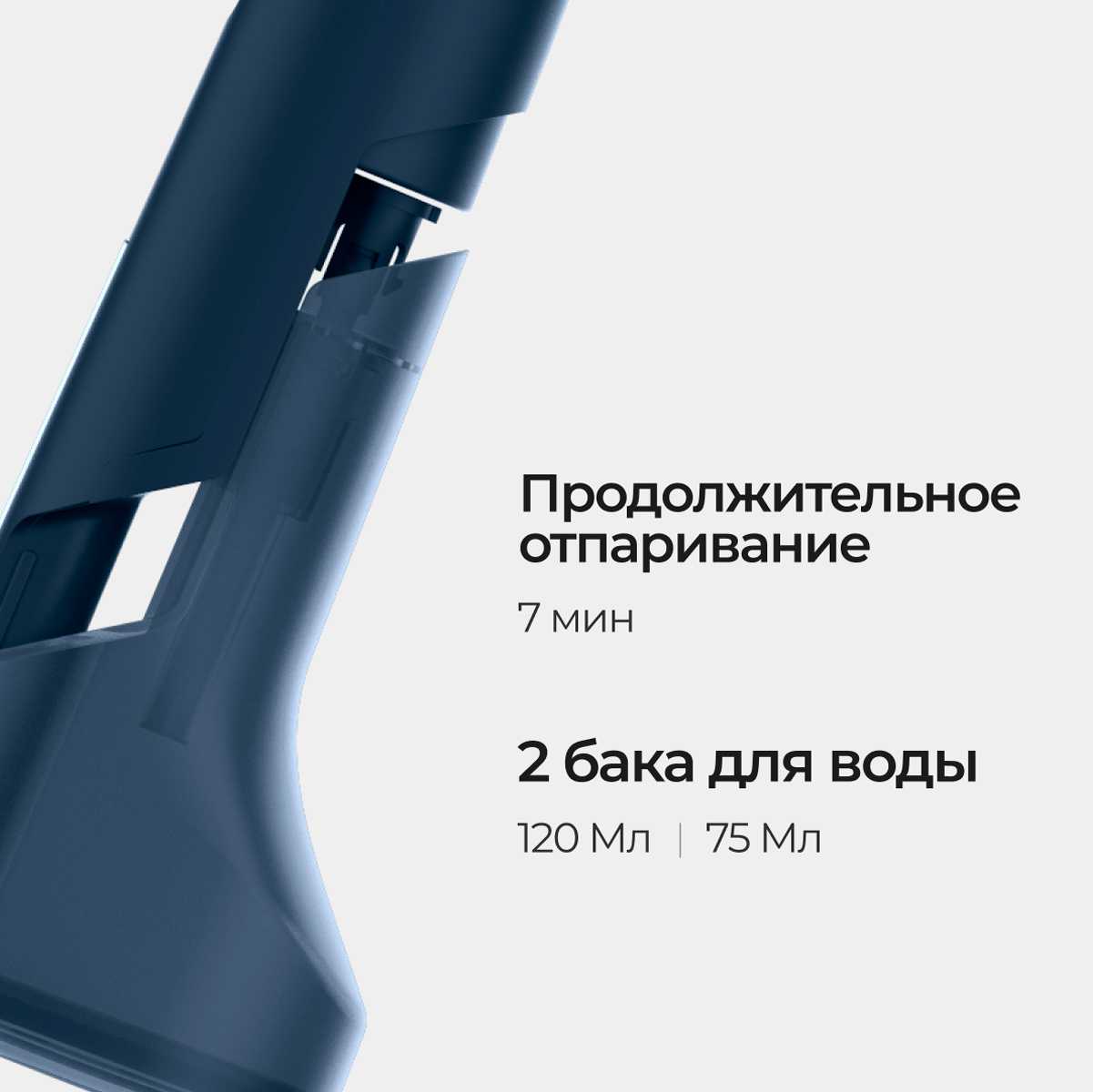 Основной бак вмещает 1200 мл, а дополнительный контейнер позволяет продлить время работы. Одной заправки хватает на обработку 10-15 вещей, в зависимости от режима. Пользователи подчеркивают экономичный расход воды по сравнению с традиционным утюгом. -