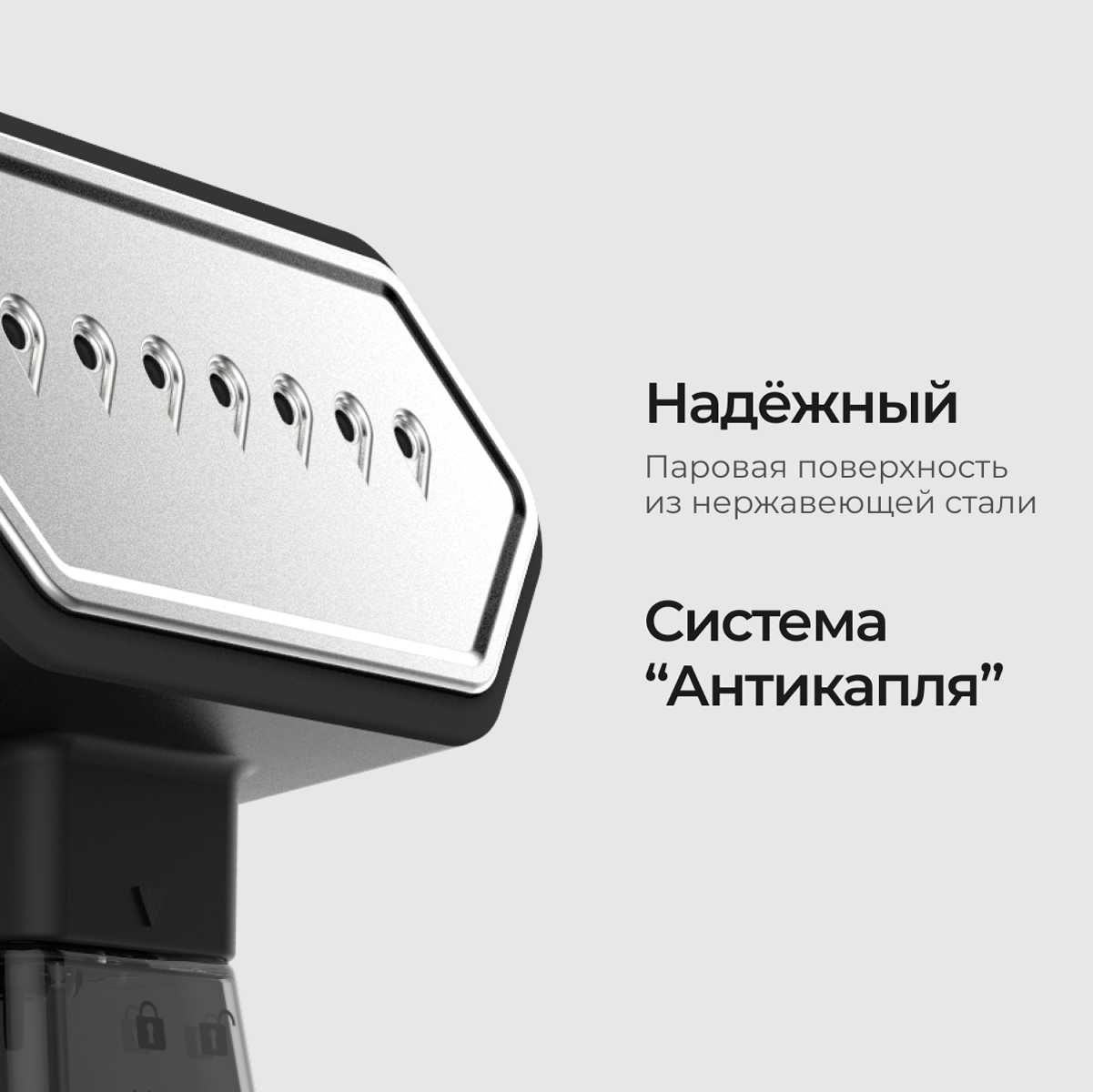 Конструкция и удобство эксплуатации: Эргономика и управление: Аппарат отличается продуманной механикой: эргономичная рукоятка обеспечивает комфортный хват, механические переключатели (2 режима мощности) надежны и интуитивны. Автоотключение при простое повышает безопасность. Съемный резервуар упрощает заправку воды, а коннектор для бутылок позволяет увеличить объем жидкости при длительной работе. Устойчивая подставка дает возможность размещения на столе без риска опрокидывания. Качество сборки и материалы: Корпус выполнен из прочных материалов, подошва из нержавеющей стали исключает прилипание ткани и образование накипи (при использовании фильтрованной воды). Длинный 3-метровый силовой кабель обеспечивает мобильность в пределах комнаты. Пользователи подчеркивают отсутствие люфтов деталей и стильный минималистичный дизайн. Портативность и хранение: Компактные габариты и вертикальная установка облегчают хранение в малогабаритных пространствах. Вес устройства (несмотря на мощность) позволяет брать его в поездки, хотя некоторые отмечают субъективную тяжесть при длительной работе.