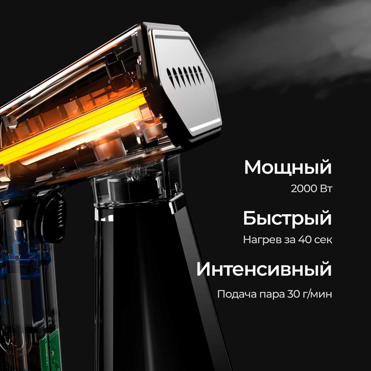 Время нагрева составляет менее минуты, что значительно быстрее многих традиционных утюгов. Мгновенный нагрев позволяет начать отпаривание практически сразу после включения, экономя время при ежедневном использовании. Корпус устройства не нагревается чрезмерно, что обеспечивает безопасность при работе и хранении сразу после использования. -