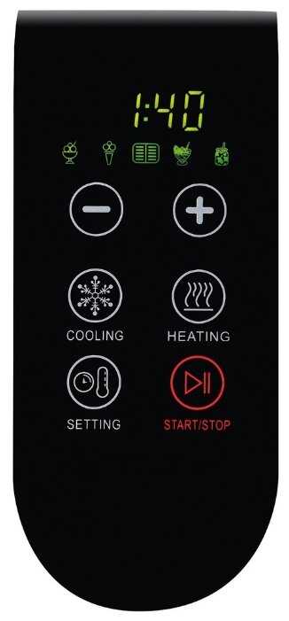 Стильная, современная и небольшая мороженица. Удобный и понятный сенсорный дисплей управления. Все работает отлично, не заедает, программа не слетает. Есть пульт дистанционного управления, на котором видно оставшееся время приготовления. Удобная съемная чаша, которая легко и без проблем моется как и вся мороженица в целом. Готовит быстро и вкусно.