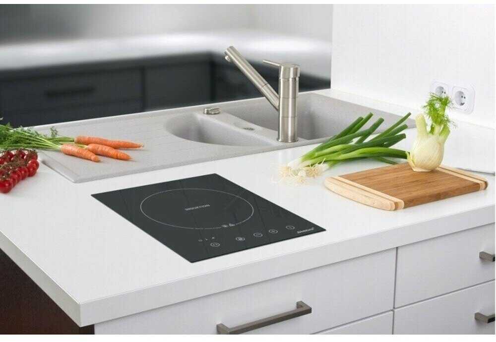 Отличительная особенность: шаг выбора температуры 5 градусов, очень удобно. На других плитах обычно шаг 20 градусов. Плита спроектирована замечательно. Диаметр посуды не ограничен размерами конфорки, т.к. нет никаких пластиковых рамок по периметру. Защита электрической схемы от сбежавших жидкостей стопроцентная. Блокировка кнопок позволяет протереть панель управления прямо во время готовки, а также защищает от баловства детей.