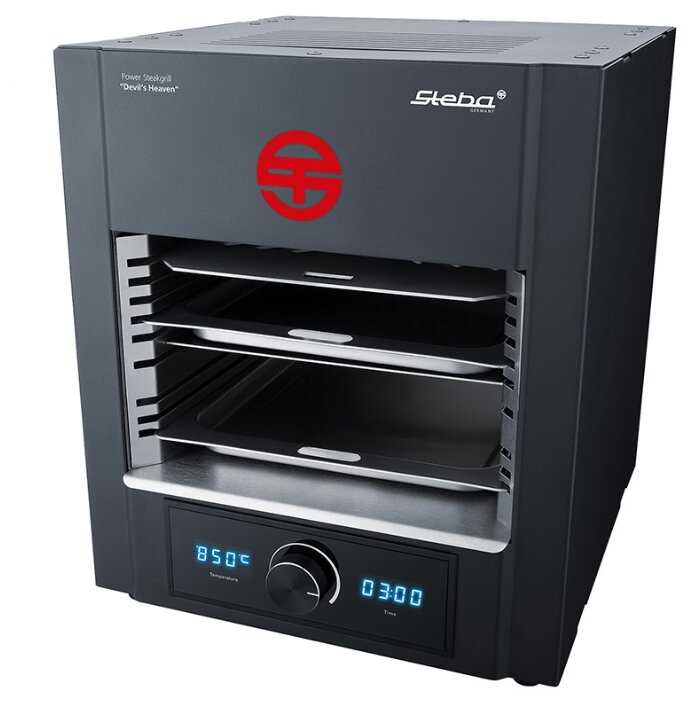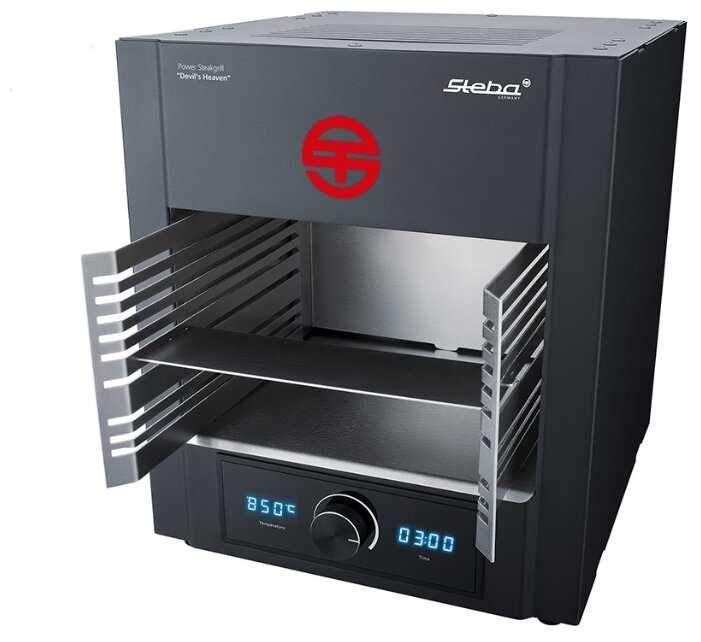 - + Идеально вписался на кухню. Очень быстро разогревается до 850 градусов. Стейк получается как в ресторане, мин 2-3 на каждую сторону.
