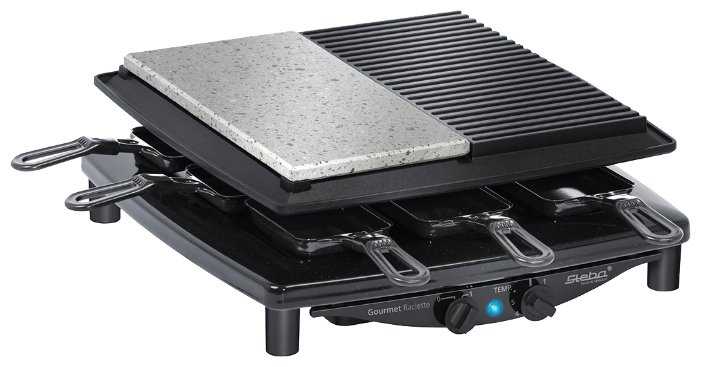 - + Очень качественная раклетница. Сменная каменная плита и рефлёная тефлоновая часть позволяют комбинировать приготовку еды, особенно мяса.