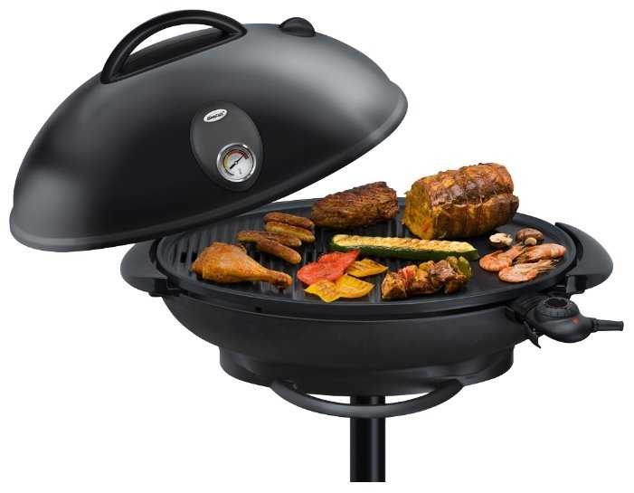 Электрогриль нужно собрать, чтобы он нормально функционировал. Он стоит на ножке, посередине есть полка на которую можно положить щипцы, которыми нужно переворачивать мясо во время готовки. В крышке есть паровой клапан. Электрогриль работает от электричества, поэтому, если есть перебои, то лучше какое-то рвемя подождать, чтобы прибор не испортился. Кстати, древесный уголь использовать в данном случае нельзя. Термостат, соответственно, регулирует температуру. Мне больше всего нравится, как получается курица. С говядиной у меня результат получился немного хуже. Овощи всегда получаются хорошо.