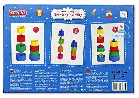 - + Качественные материалы (с виду). Хорошо, что можно собрать четырьмя разными способами. Для самых малышей пока пирамидку можно просто собрать. А дополнительный уровень сложности - это ещё и внутри фигурки вставить.