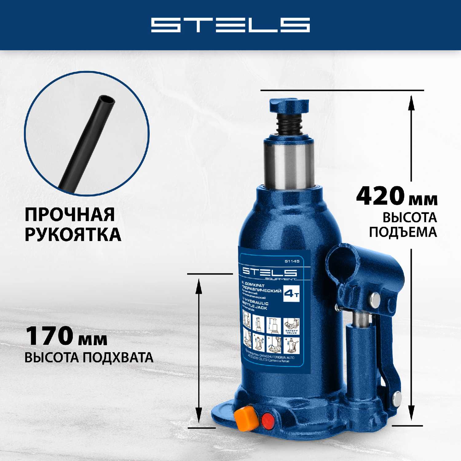 Характеристи Stels Домкрат бутылочный гидравлический для мототехники (51145)