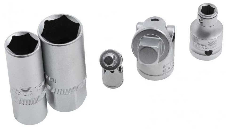 - Наличие удлинителей, кардана и свечных головок с магнитом позволяет работать в стесненных условиях (например, при замене свечей или демонтаже стартера).