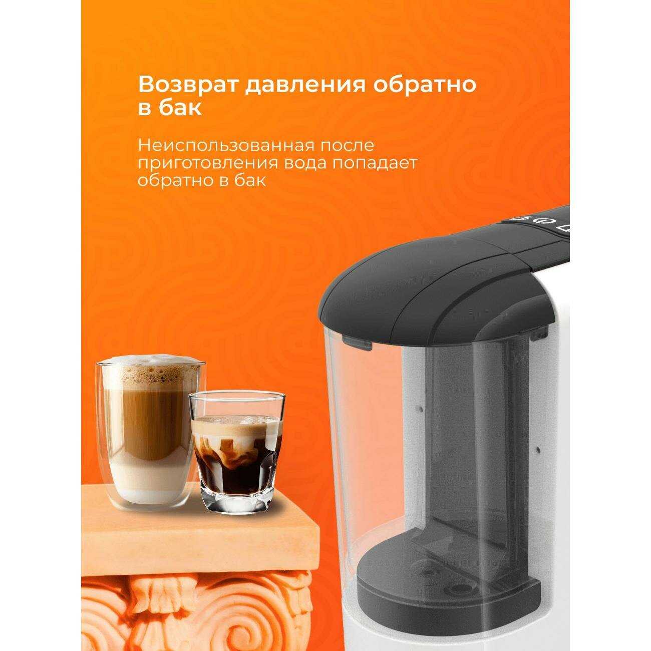 Резервуар небольшой, рассчитан на 1-2 большие чашки или 5-6 маленьких, в зависимости от порции. Пользователи отмечают, что для одного-двух человек этого достаточно, но для большой компании нужно доливать воду чаще. Некоторые хвалят большой бак для гостей, но большинство отзывов указывают на компактный объем как на ограничение. Регулировка порции помогает оптимизировать использование. В отзывах это не критично для ежедневного домашнего потребления. -