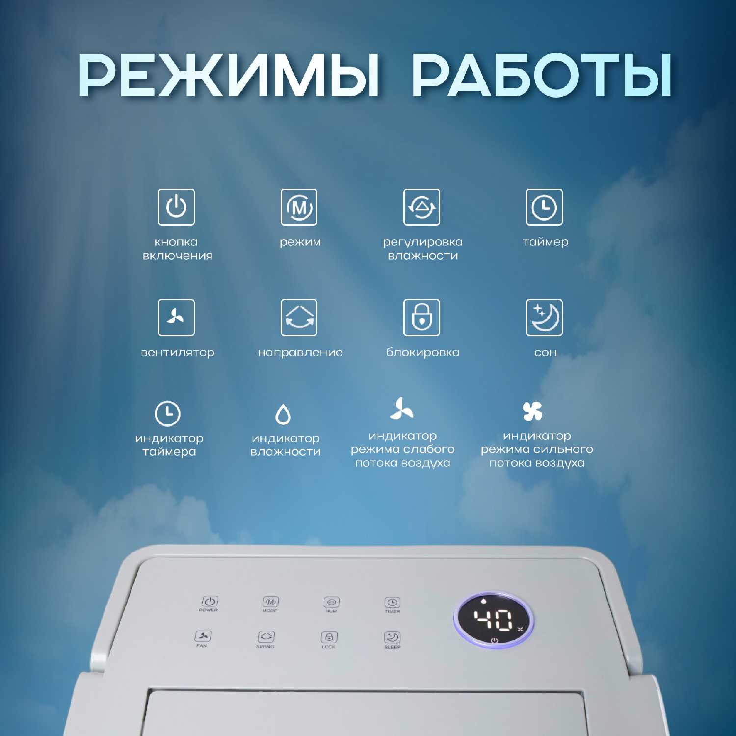 - Функция swing обеспечивает распределение воздушного потока по помещению, повышая равномерность осушения.