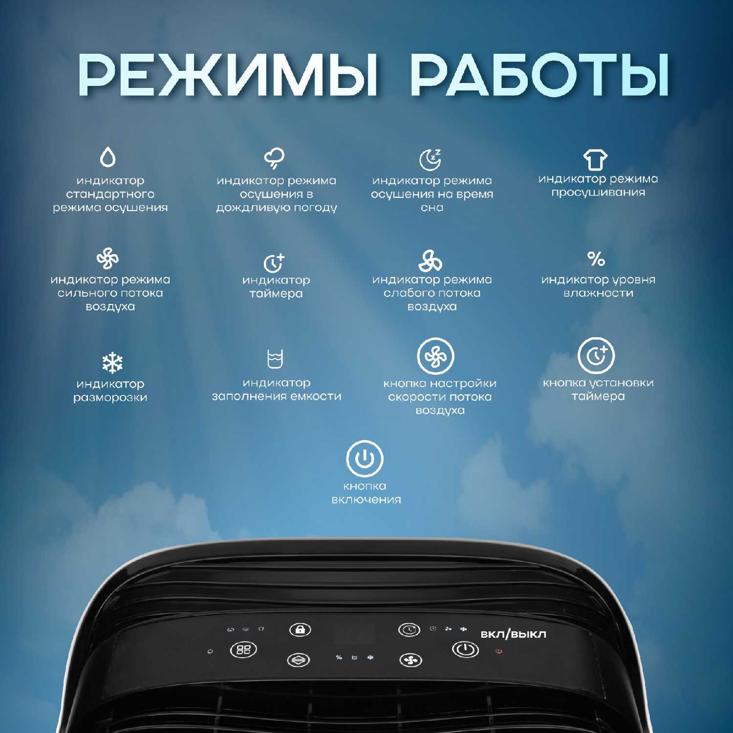 Осушитель оснащен сенсорной панелью управления с интуитивно понятным интерфейсом. Доступные функции включают ночной режим, сушку белья, блокировку от случайных нажатий и регулировку скорости вентилятора. Некоторые пользователи отмечают возможность направления воздушного потока и отображение текущей влажности на дисплее. Однако встречаются сообщения о отказах сенсорной панели в отдельных экземплярах, что требует гарантийного обслуживания. -