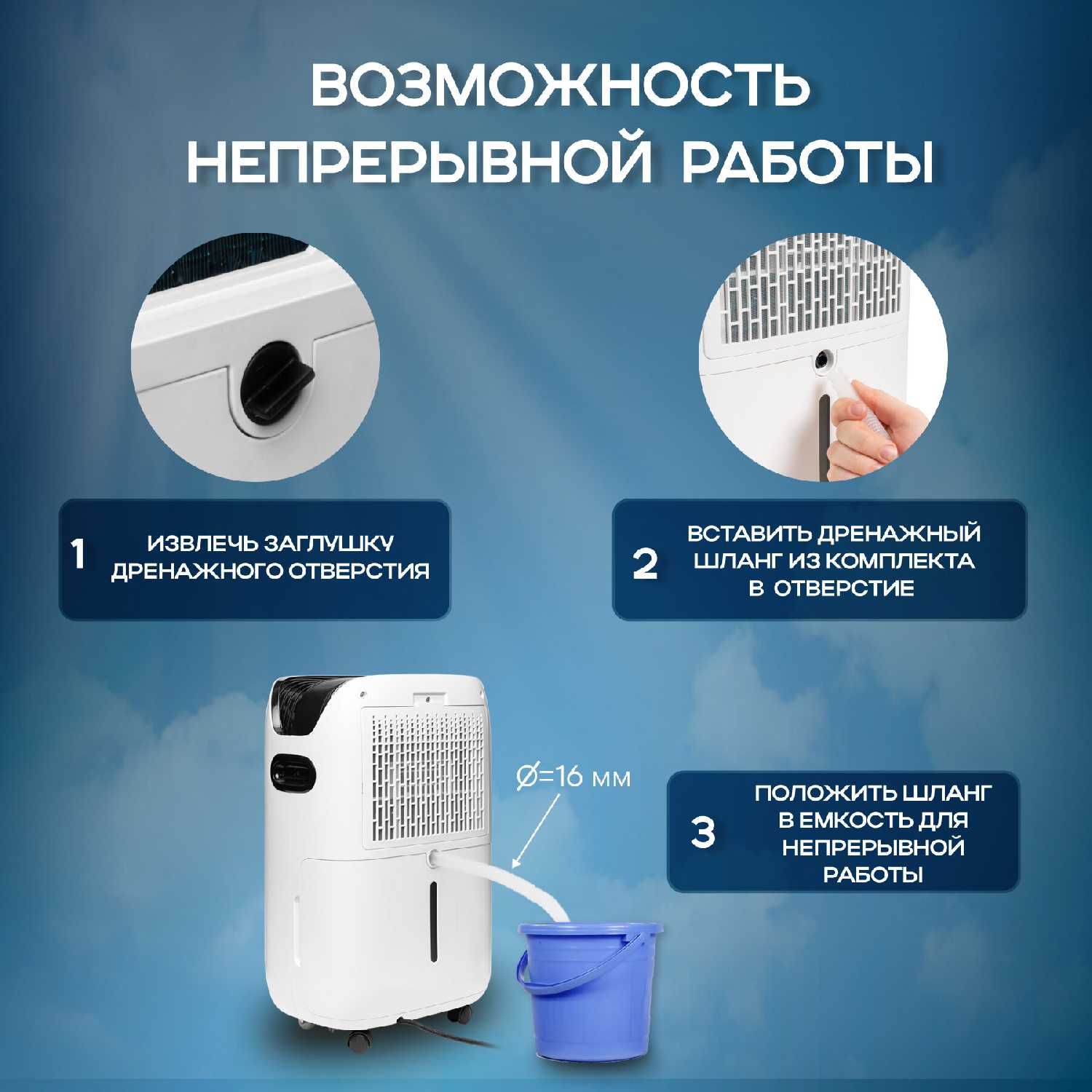 Устройство оборудовано встроенным баком объемом 5 литров с удобной системой извлечения и опорожнения. Для продолжительной работы предусмотрен дренажный выход с возможностью подключения штатного шланга для непрерывного слива. Пользователи отмечают эффективность капсулы для слива, хотя некоторые столкнулись с незначительным подтеканием при извлечении бака. При длительном отсутствии рекомендуется использовать дополнительную емкость или дренажную систему. -