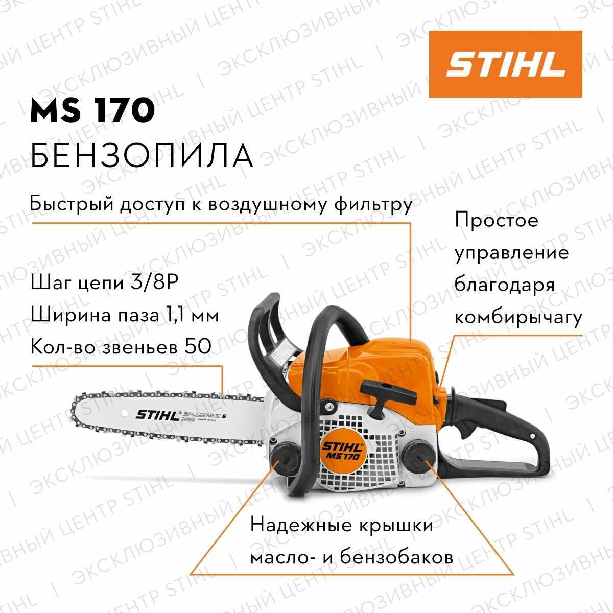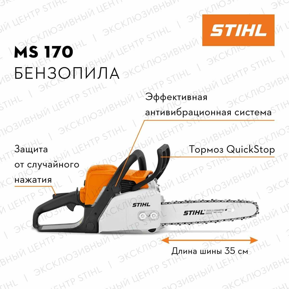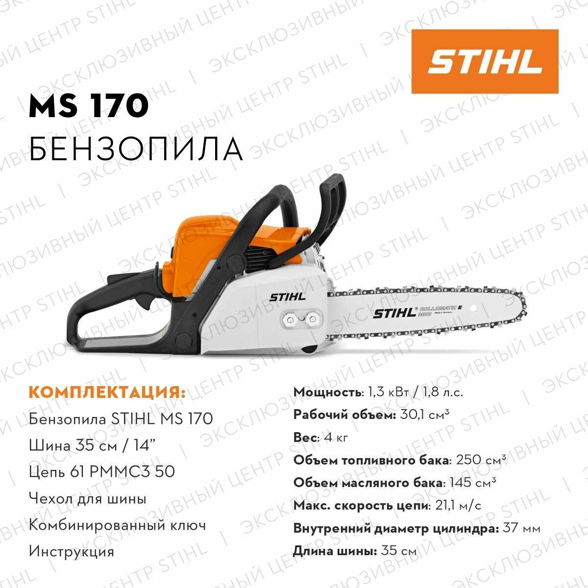 как оказалось я нашёл как минимум 3 модели с назвнием Stihl MS 170 моя на- 40см длинна шины ,так же есть на 35см и с праймером и ещё 3-я не помню различие ,шину можно менять самому если что ,прокупал свою версию без Праймера (праймер грубо говаря это мягкая кнопка прозрачная где бензин-- при ножатии удаляет воздух)--(пояснение более точное с сайта DNS--- Праймер служит для удаления воздуха из топливной системы. Нажимая на него 5-7 раз перед включением, вы позволяете топливу беспрепятственно попадать в карбюратор так устройство быстрее и легче запускается.),в принципе нормально без него, заводится примерно на 3--6--й раз дерганья за шнурок, при прогретой пиле с 1--3 раза, в комплекте была цепь (заточена отлично),чехол для шины пластиковый, ключ-отвертка плоская для пилы и инструкция на разных языках(русский язык присутстует)брал пилу за 13399р 07,2025 года