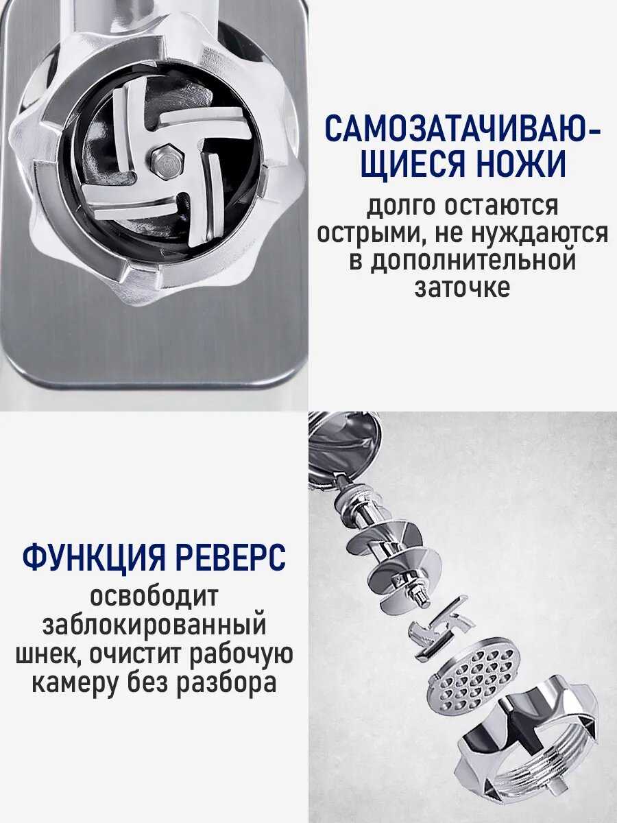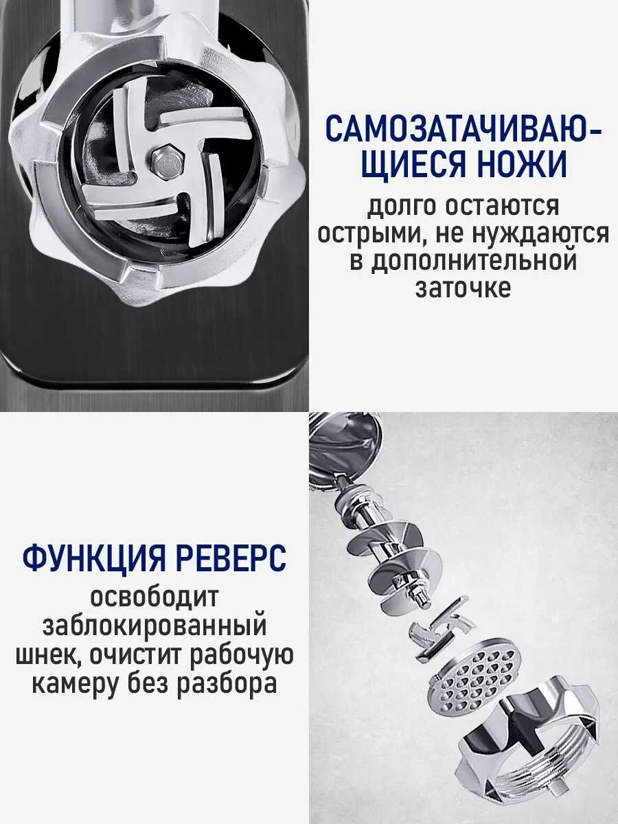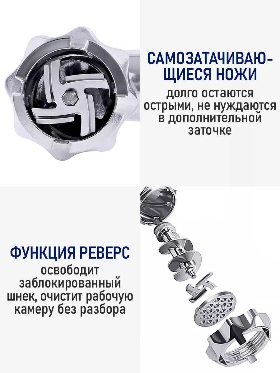 - Перемалывает 2-3 кг мяса за 2-5 минут благодаря эффективной работе шнека.