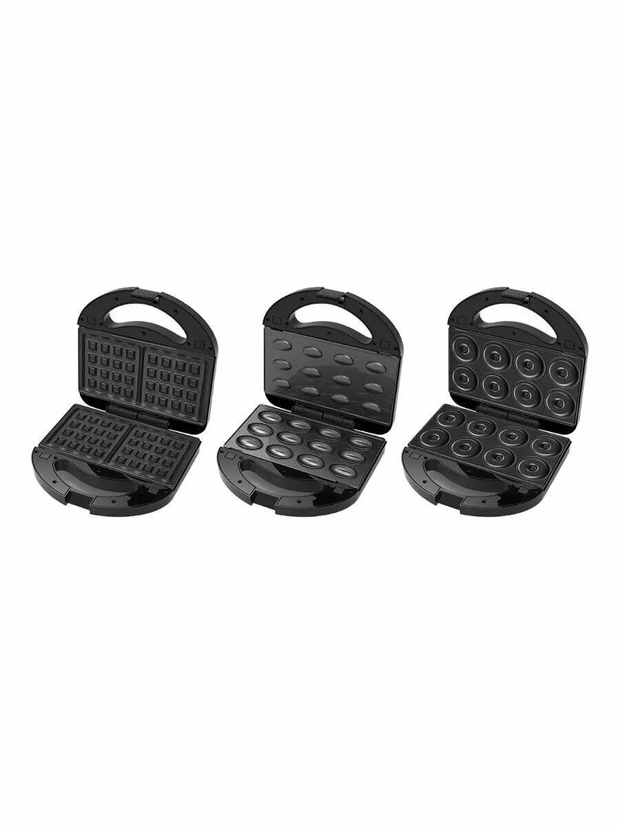 - 6 сменных насадок позволяют готовить разнообразные блюда: от классических вафель до мясных закусок и бутербродов.