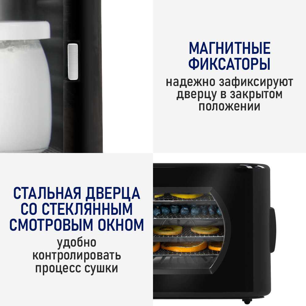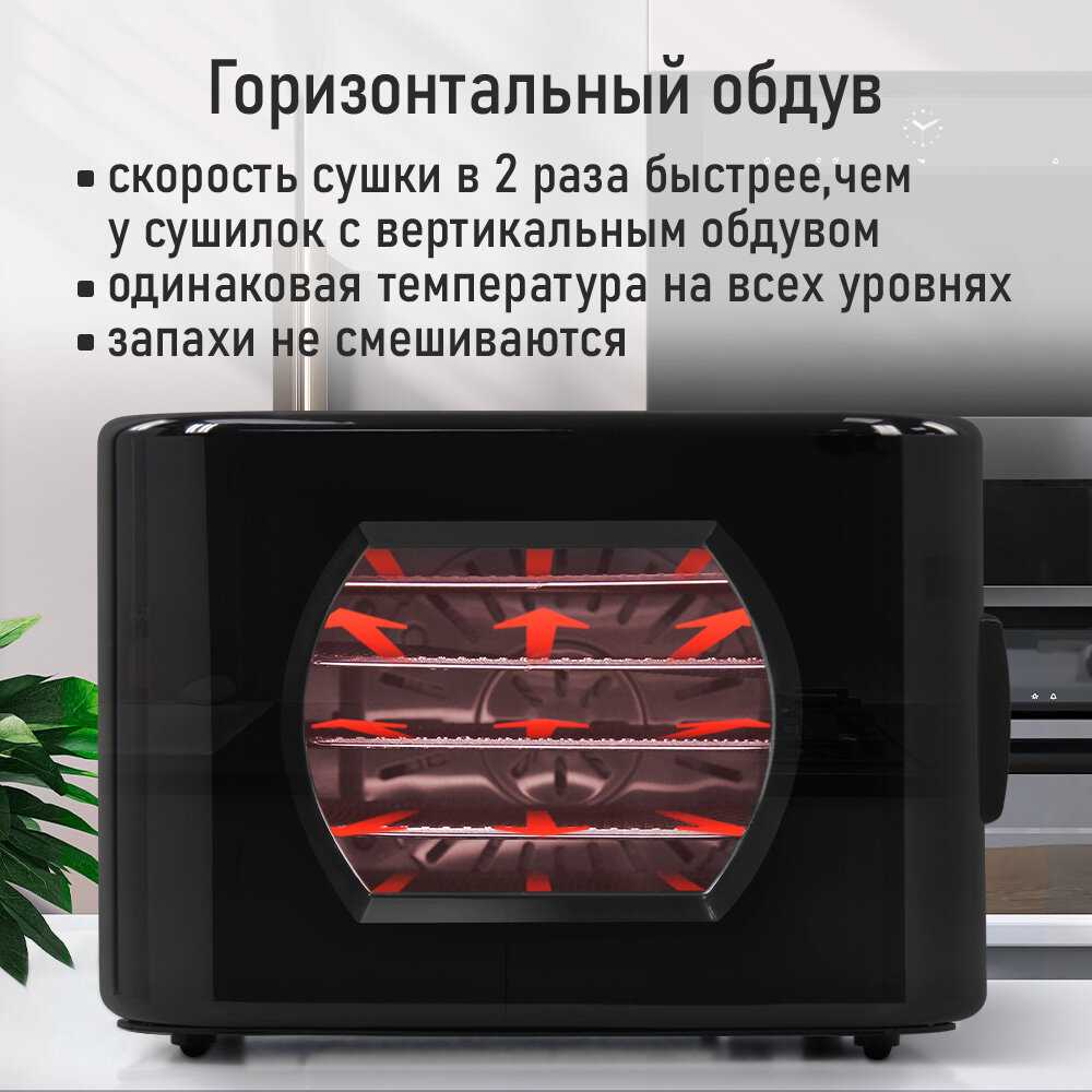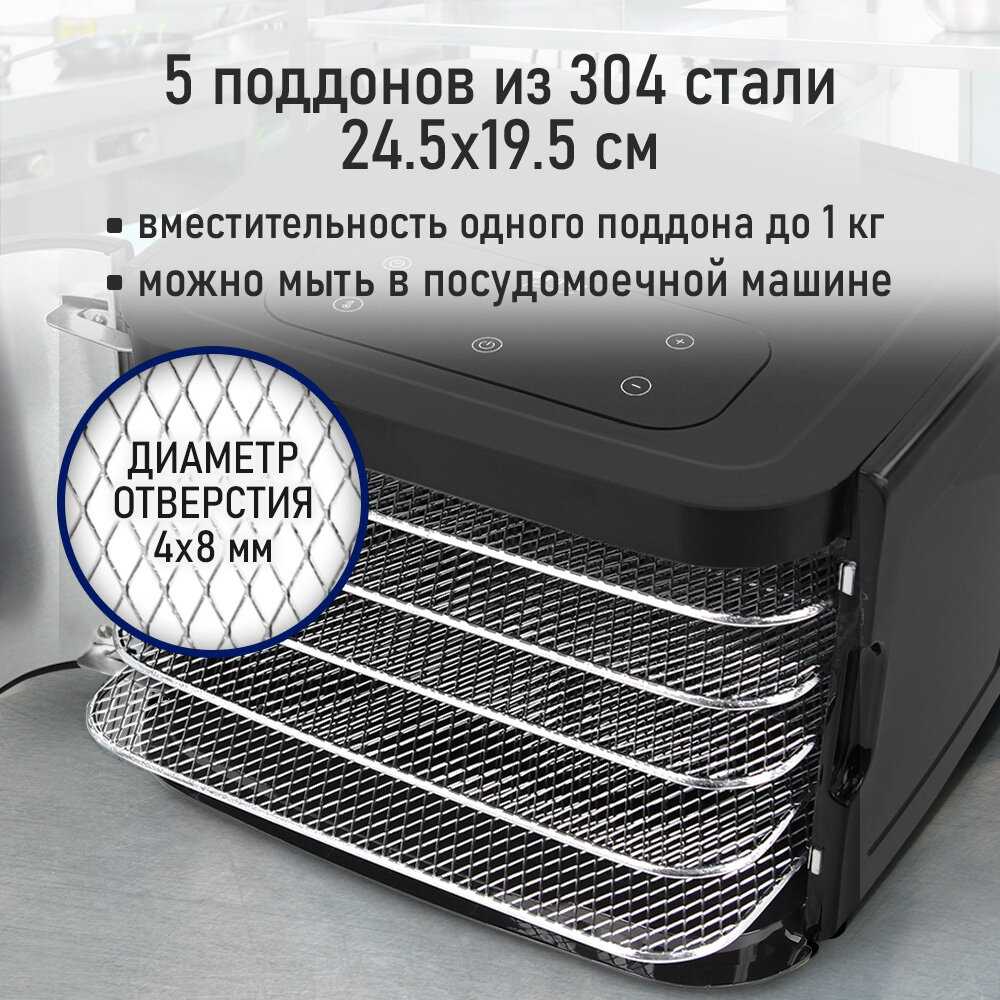 Компактная, вместительная сушка. 1,5 кг мяса подсушила за 8 часов. Из-за бокового обдува происходит равномерный прогрев всех поддонов