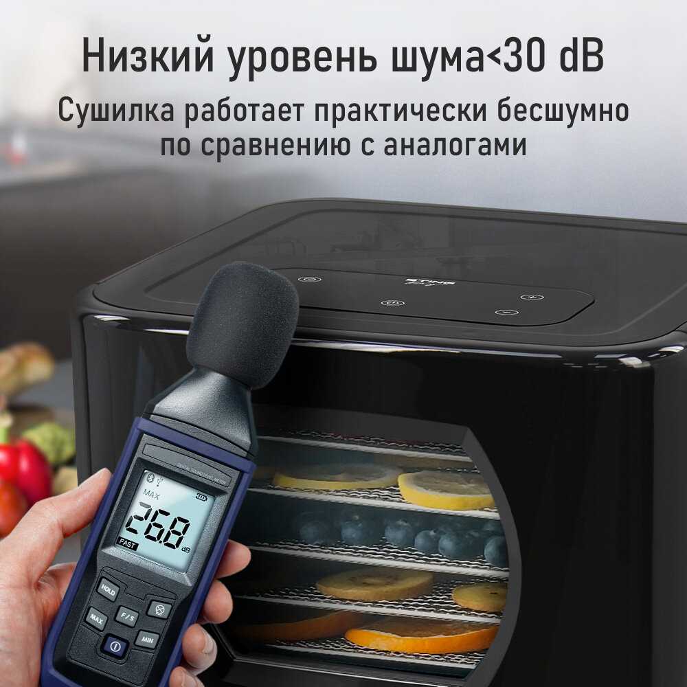 при работе есть небольшой шум, хорошо сушит грибы и фрукты. очень довольна покупкой