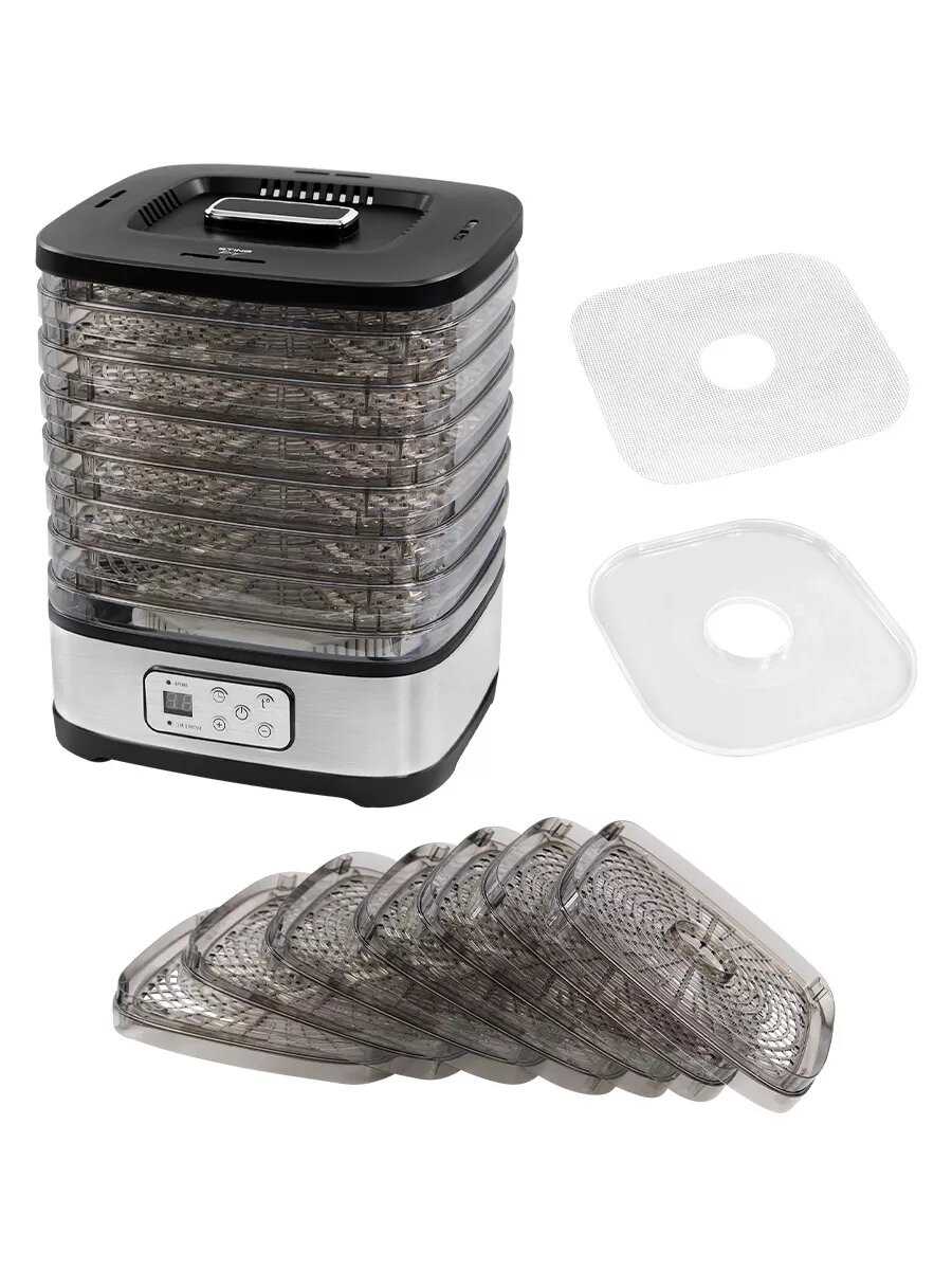 - Семь поддонов позволяют одновременно сушить до 5 яблок и 3 бананов, обеспечивая эффективное использование пространства на кухне без занятия большого места.
