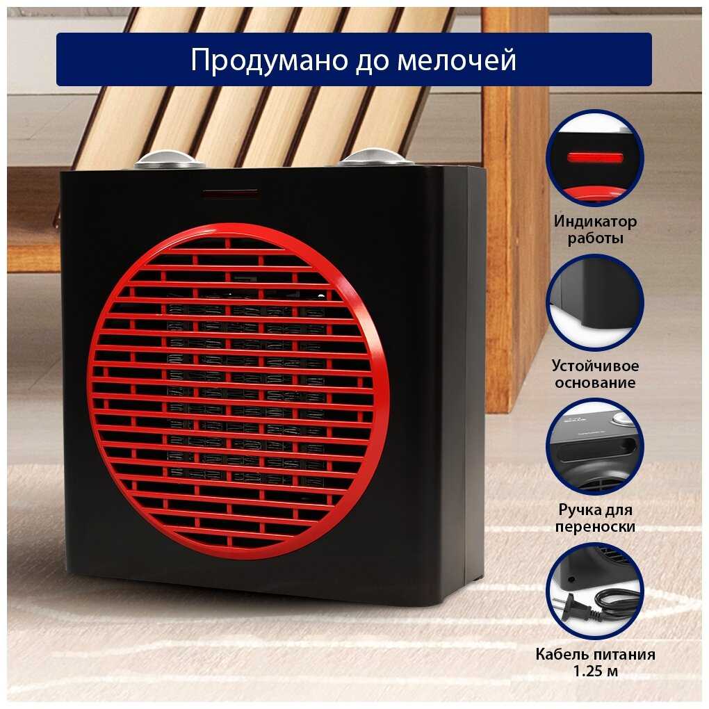 - Несмотря на малые габариты, эффективно прогревает помещения до 20 м² благодаря керамическому нагревательному элементу.