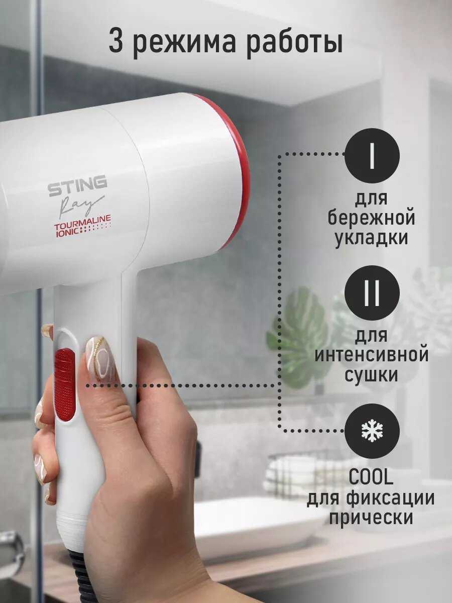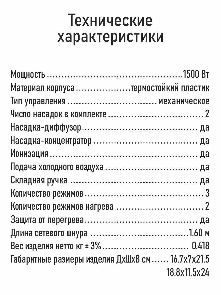 - + Фен работает хорошо. Сделан из качественного пластика без зазоров и литников. Есть 3 режима: холодный воздух на большой скорости; горячий воздух на средней скорости; горячий воздух на большой скорости.