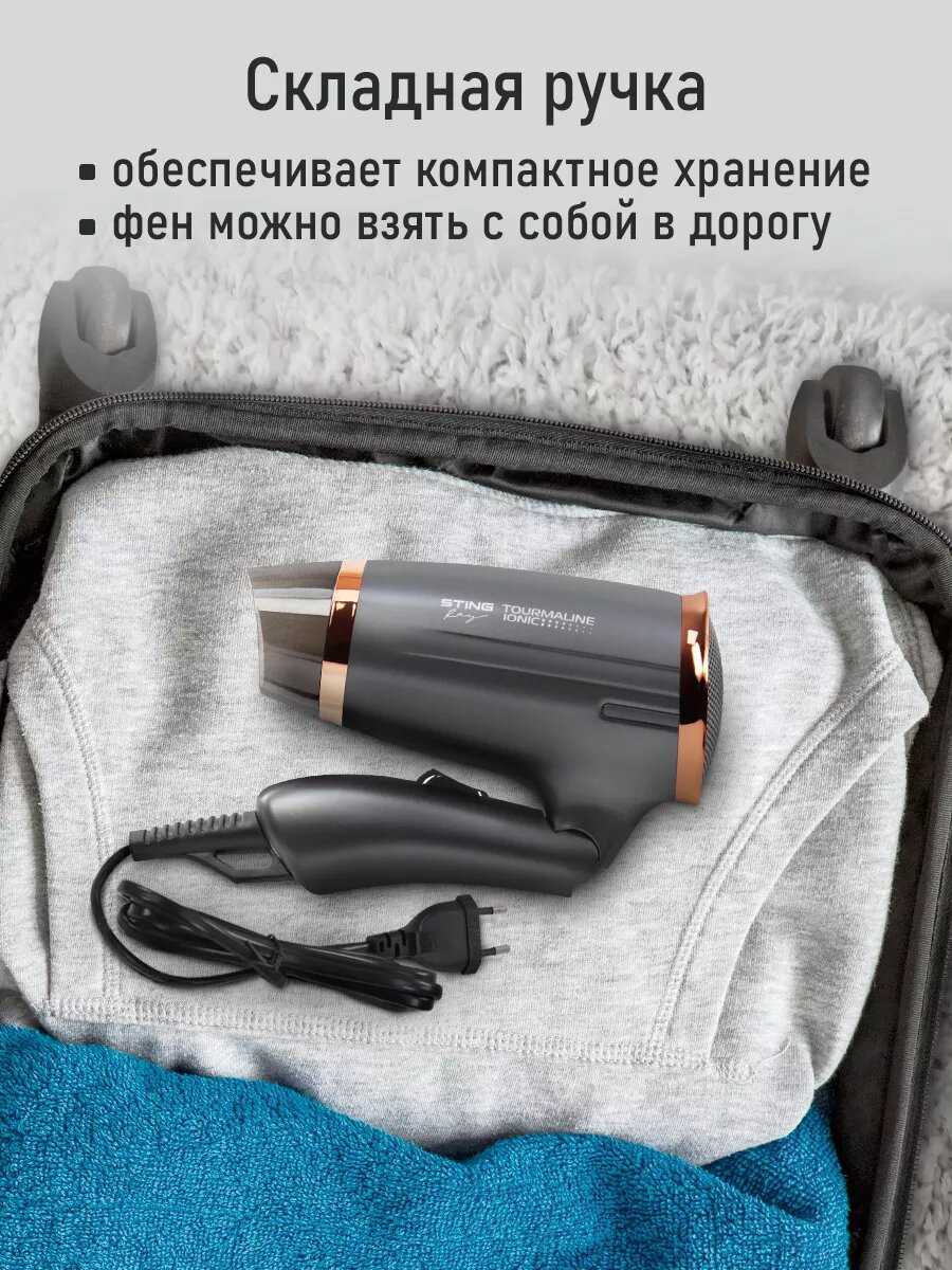 Компактные габариты и возможность сложить ручку делают фен удобным для транспортировки. Многие пользователи специально отмечают, что брали его для поездок на дачу или в путешествия. Легкий вес и небольшие размеры позволяют легко разместить фен в дорожной сумке без занимания много места. -
