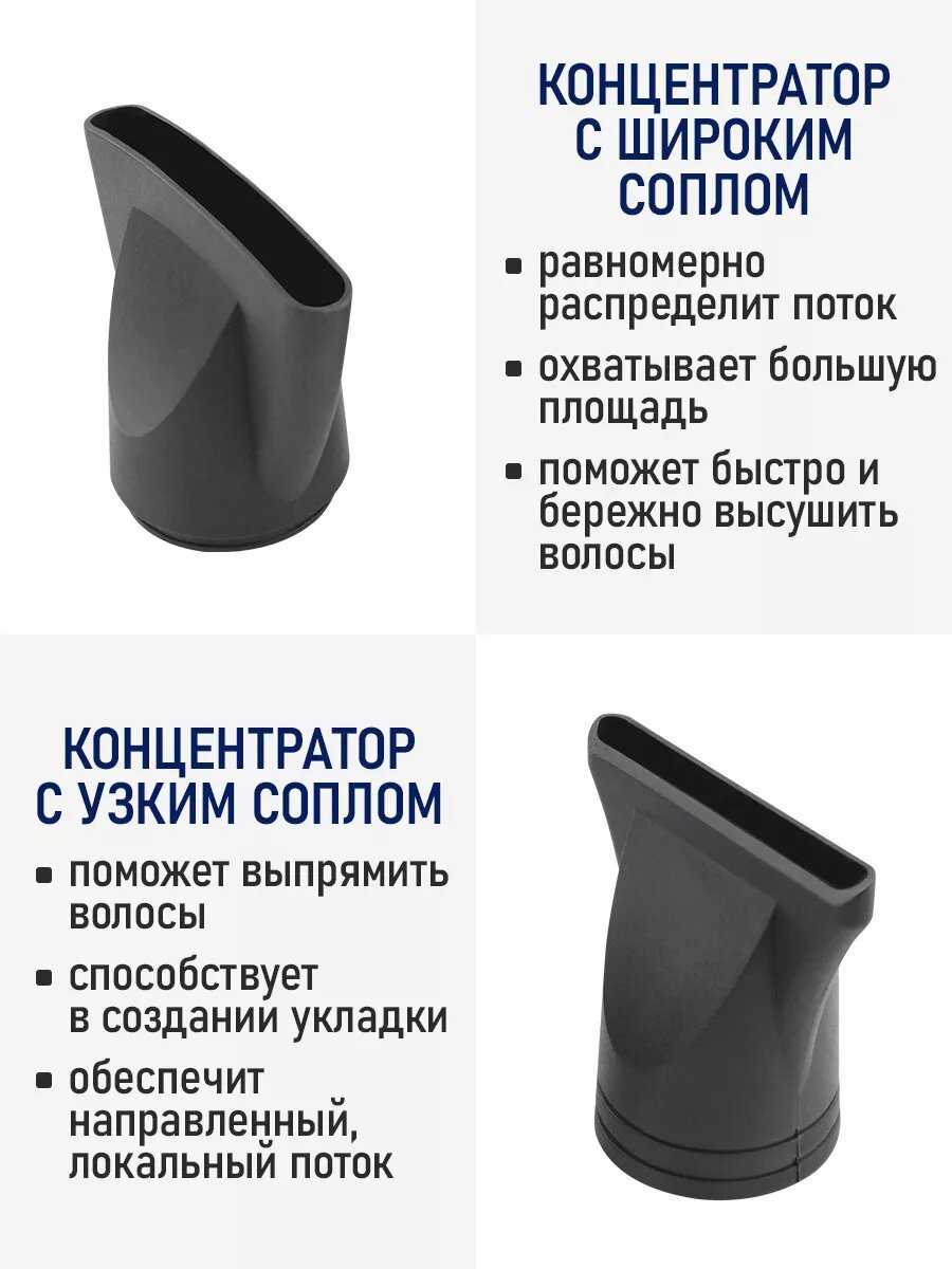 - Две насадки (включая концентратор) позволяют адаптировать фен под разные сценарии, повышая универсальность использования.