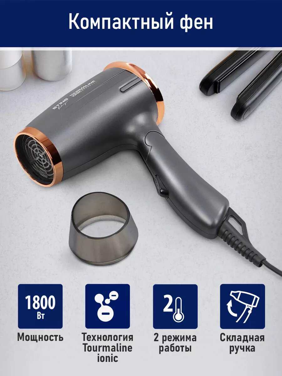 Корпус фена выполнен в стильном дизайне с приятным цветом, а его форма удобно лежит в руке. Многие пользователи хвалят компактные размеры и возможность складывания ручки, что делает фен портативным и удобным для хранения или путешествий. Однако некоторые отмечают, что фен может показаться тяжеловатым при длительном использовании. -