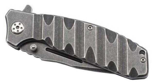 Целиком металлический. На одной щеке рукояти есть подпальцевые выемки, на другой - крепление на карман.