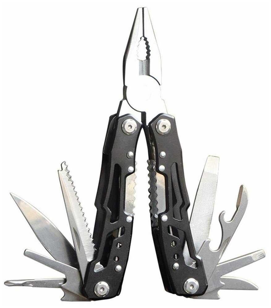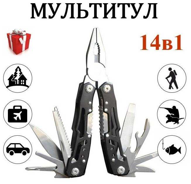 | Дополнительная информация : | количество инструментов (функций): 14, материал инструмента: нержавеющая сталь, инструменты (функции) подробно: Открывалка для консервов Пила Шило Отвертка плоская Открывалка для бутылок Напильник по дереву и металлу Нож прямой Кусачки обычные Отвертка крестовая Острогубцы Плоскогубцы, ширина: 46 мм, заточка: прямая |