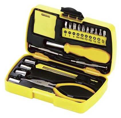 | Ручной инструмент подробно : | Рукоятка отвёрточная для бит 1 шт., Нож канцелярский – 1 шт., Отвёртка прецизионная – 2 шт., Рулетка измерительная (1 м) – 1 шт., Длинногубцы – 1 шт. |