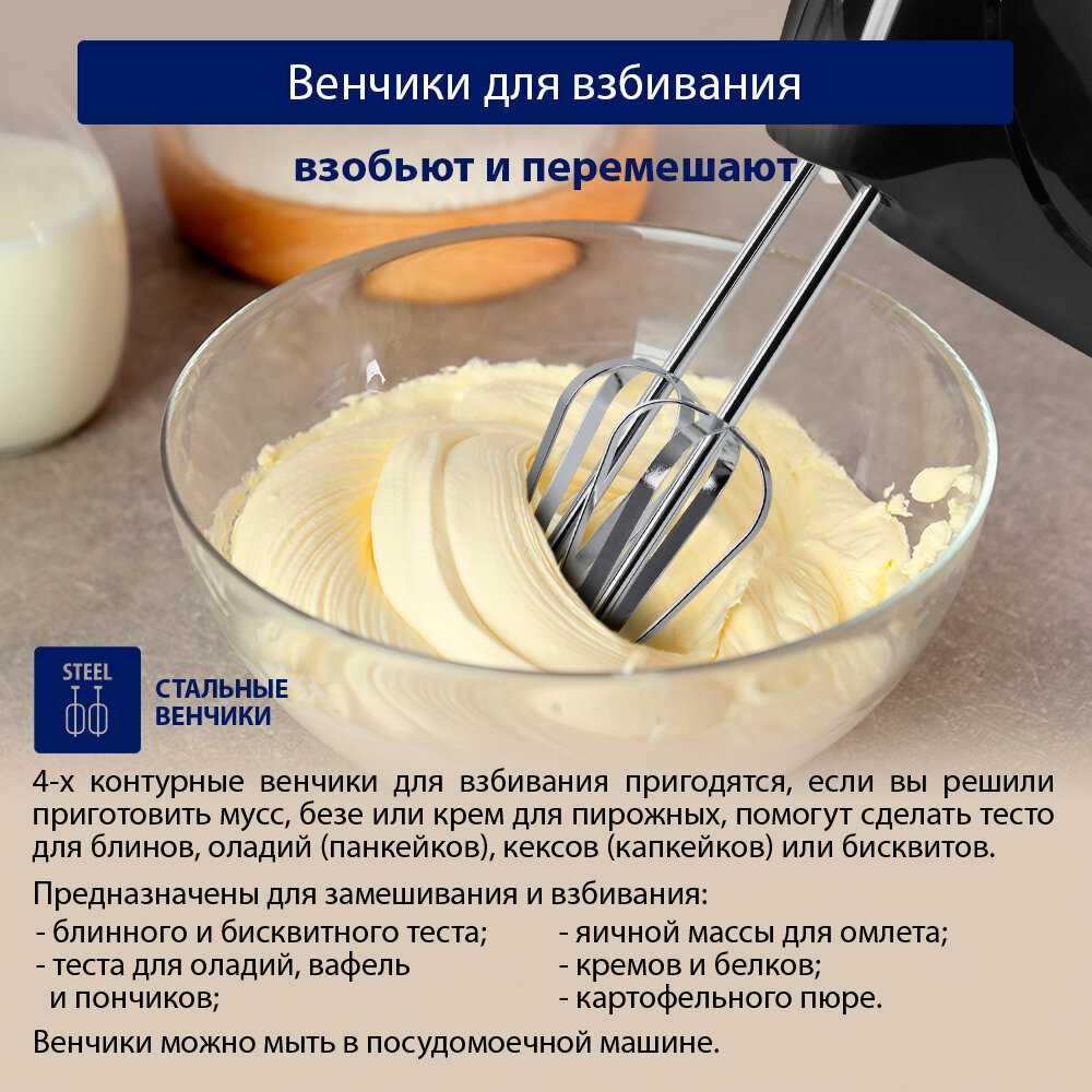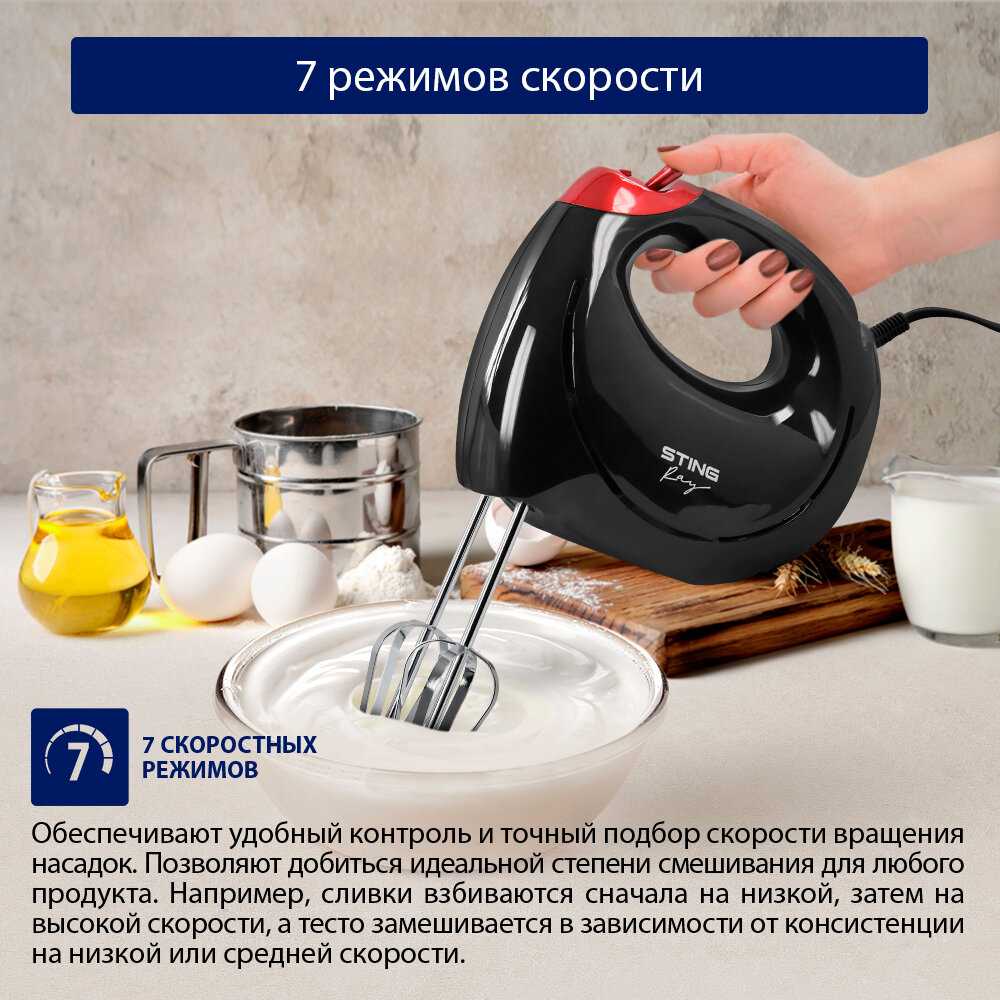 - - Последняя скорость не самая быстрая, в комплекте только 2 венчика, нет насадок для теста. При выключении с 7 скорости нужно промотать все скорости назад, и только потом выключать.