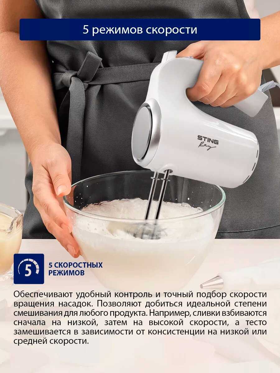 Эргономика, удобство использования и управление: Эргономика ручки получает положительные оценки: пользователи отмечают, что рука не устает даже при продолжительной работе, форма корпуса продумана и удобна для хвата. Однако вес устройства ощутим, и при длительном непрерывном использовании это может вызывать усталость. Система переключения пяти скоростей реализована удобно, переключать режимы в процессе работы легко. Тем не менее, существуют серьезные замечания к самой реализации скоростных режимов. У части устройств наблюдаются дефекты: первые две скорости могут не функционировать, миксер запускается сразу с третьей скорости. Разница между скоростями, по мнению некоторых пользователей, недостаточно выражена, что сводит на нет практическую пользу от наличия пяти режимов. Отдельным недостатком является высокая стартовая скорость, которая не подходит для начального этапа замеса густого теста. Крепление сетевого шнура на ручке может мешать устойчивой установке миксера на стол.