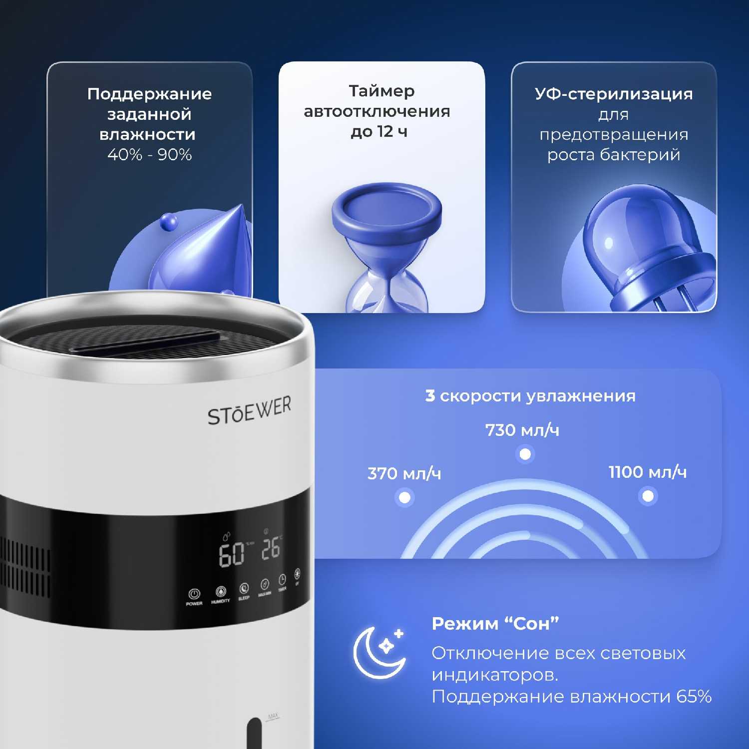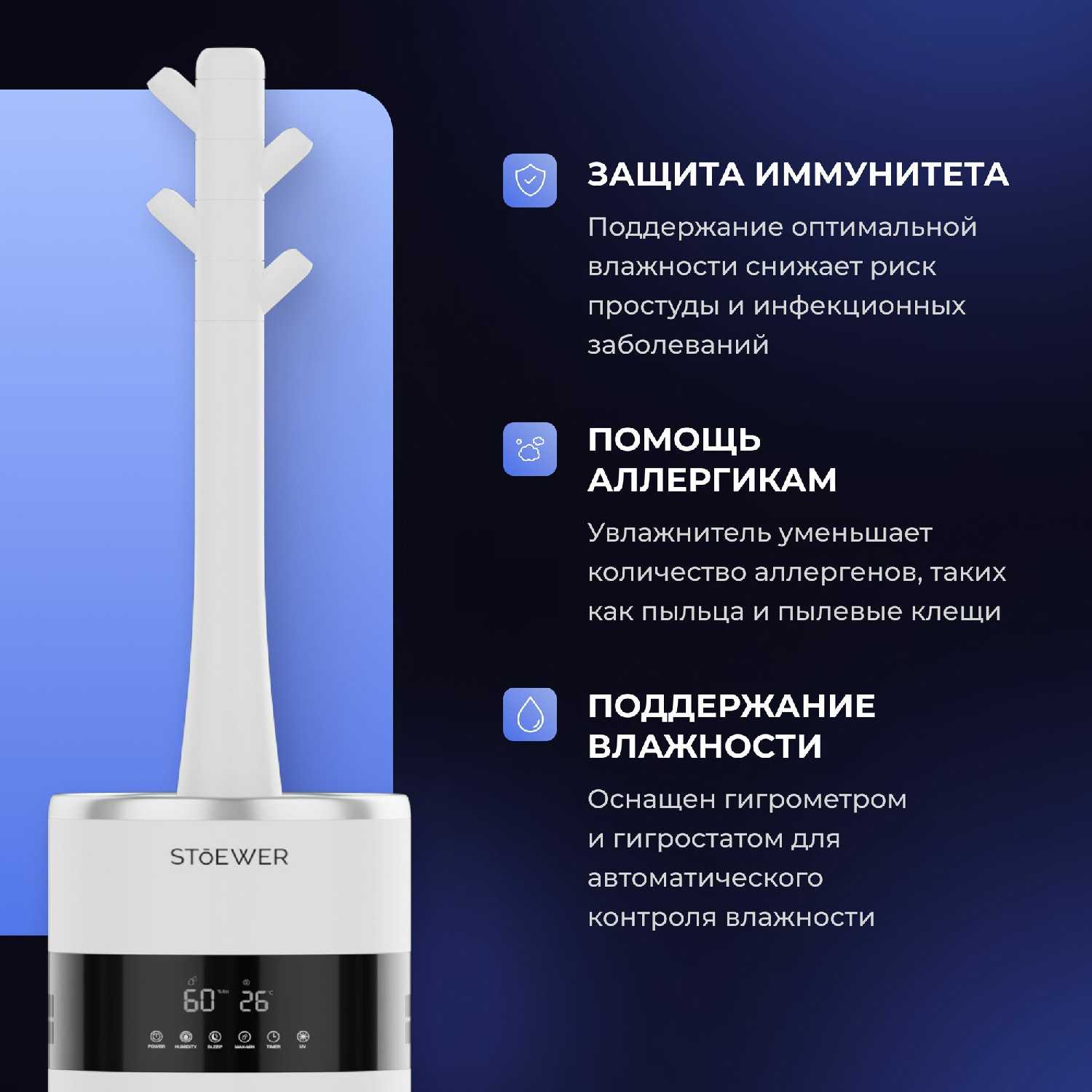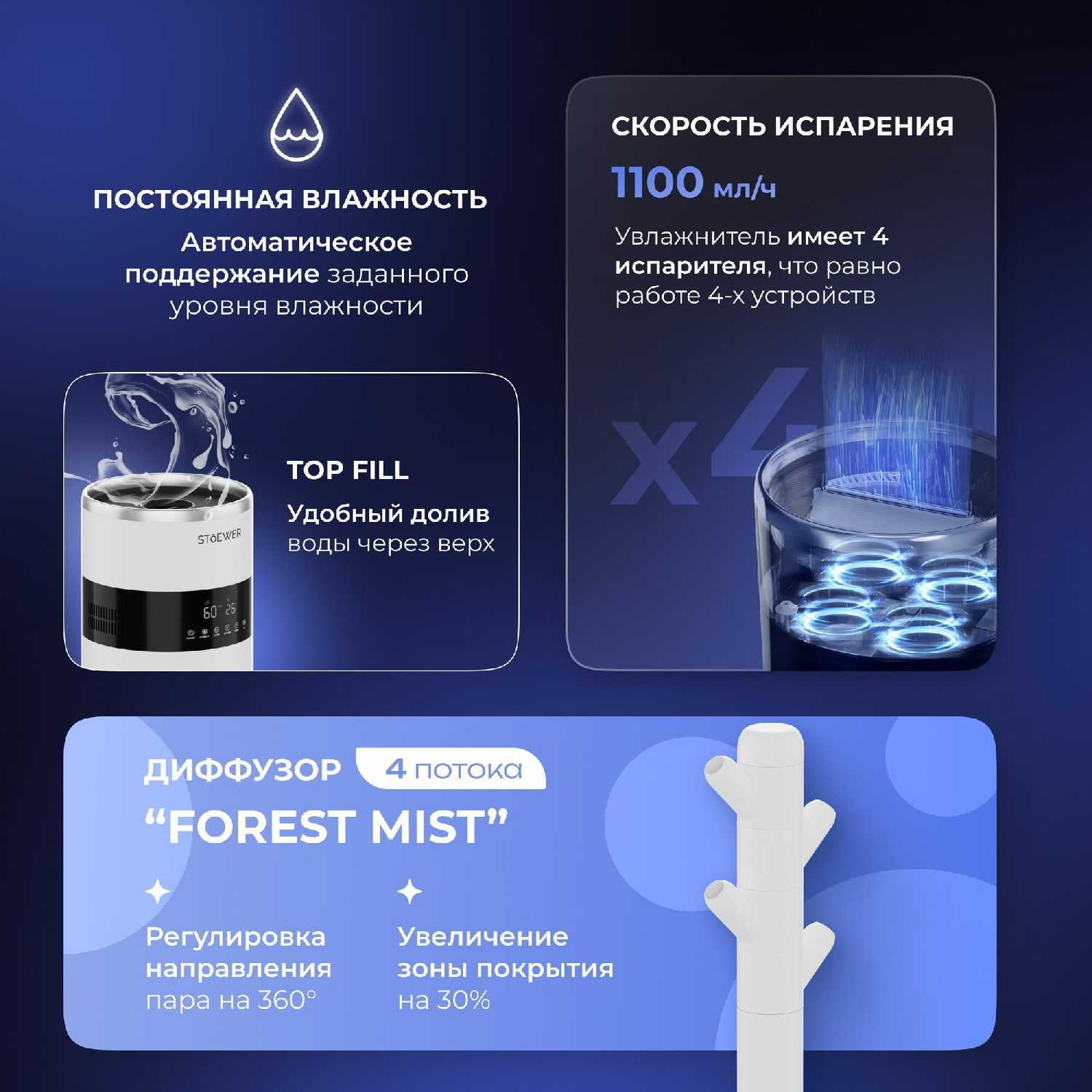 - + Стильный дизайн, очень мощный и парит сразу во все стороны. Верхний направитель можно собрать как конструктор и направить в любую сторону. Вмещает 18 литров! Если надолго оставить на высокой мощности - в комнате будет туман. Работает тихо, есть уф очистка.