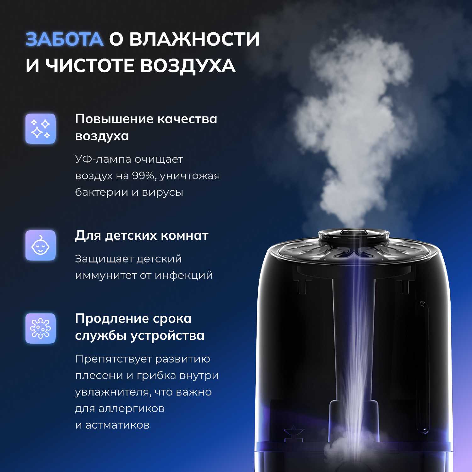 - Режим дезинфекции активируется отдельно от основной функции увлажнения.