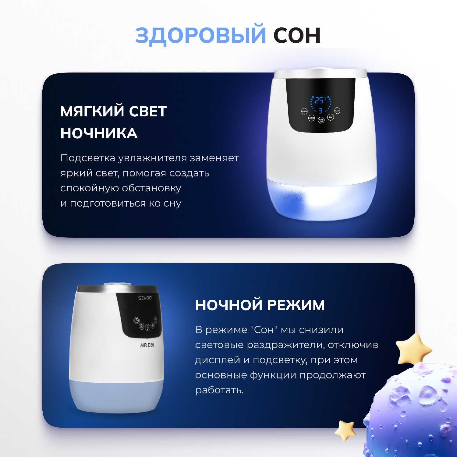 Ночной режим снижает интенсивность увлажнения и шум вентилятора, но не устраняет булькающие звуки полностью, а активирует неотключаемую УФ-подсветку. Это может мешать людям, чувствительным к свету во время сна, несмотря на заявленную "тишину". Пользователи отмечают отсутствие значительной разницы в громкости по сравнению со стандартными настройками. Для комфортного использования рекомендуется тестировать режим до постоянной эксплуатации в спальне и размещать прибор на расстоянии от кровати. -
