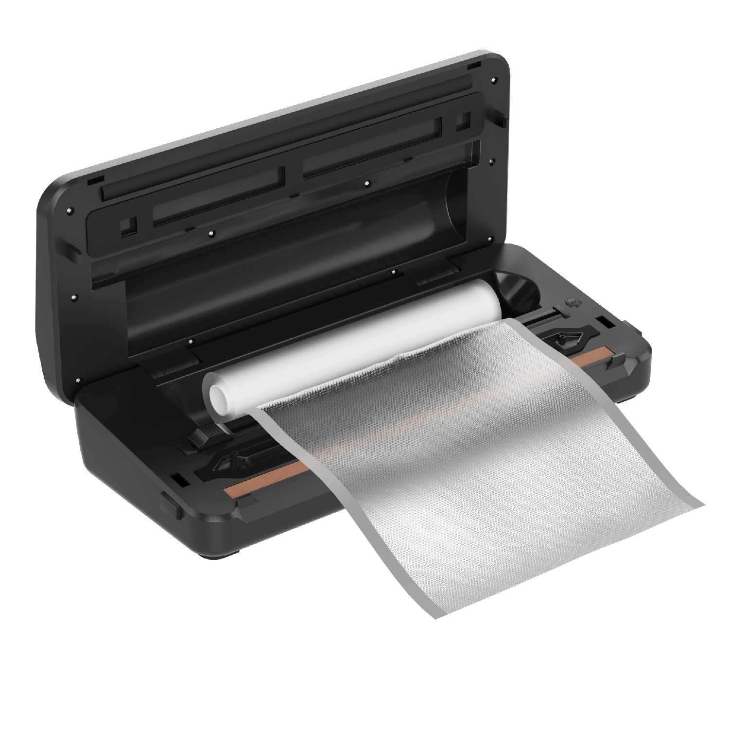 Вакууматор имеет встроенный отсек для размещения рулона с пакетами, что исключает необходимость отдельного хранения расходников. Конструкция предусматривает удобную подачу пленки и ее фиксацию перед началом работы. Такое решение позволяет всегда иметь пакеты под рукой и экономит пространство на кухне. -
