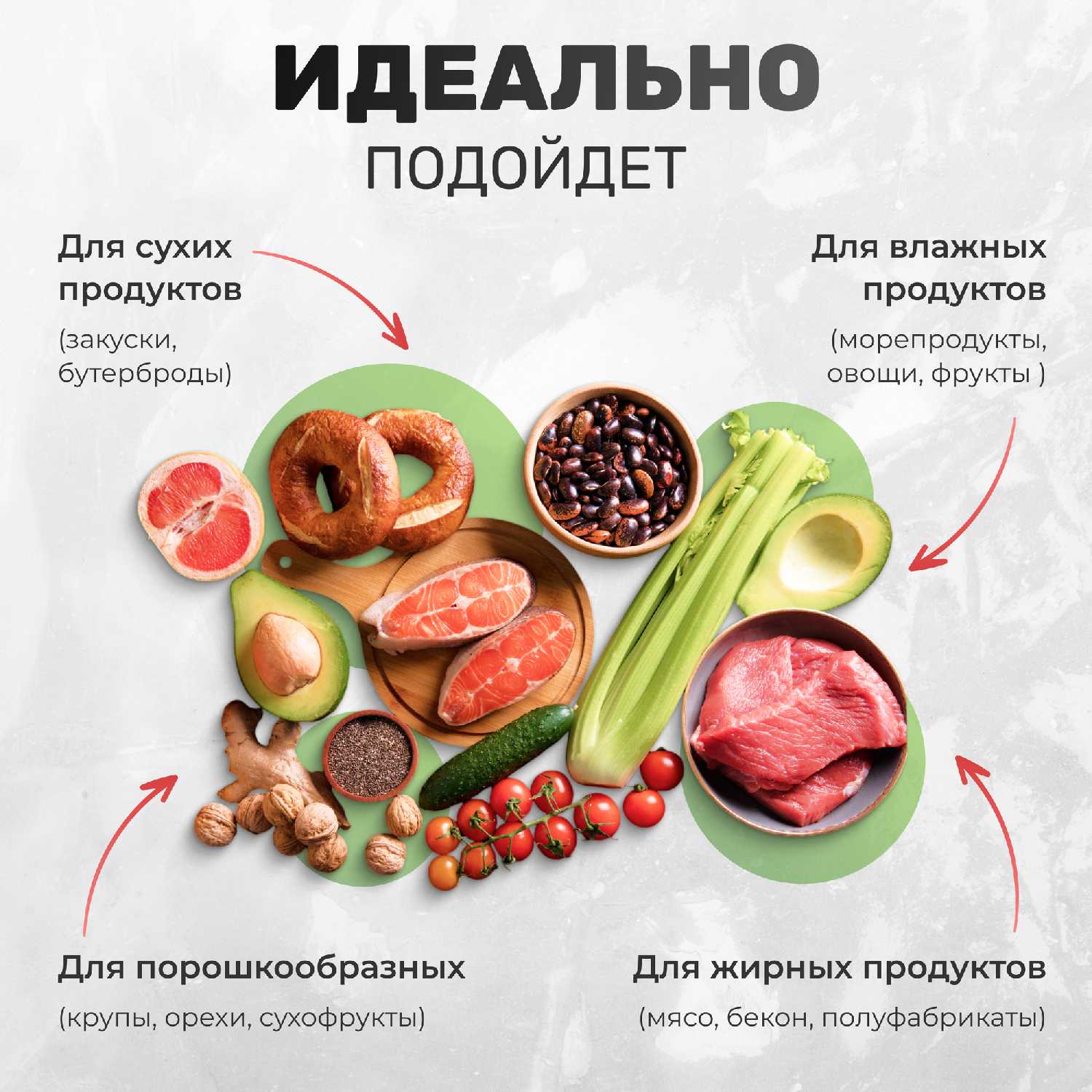 - Эффективно упаковывает сыпучие продукты вроде ягод, не давя их и сохраняя форму для длительного хранения.