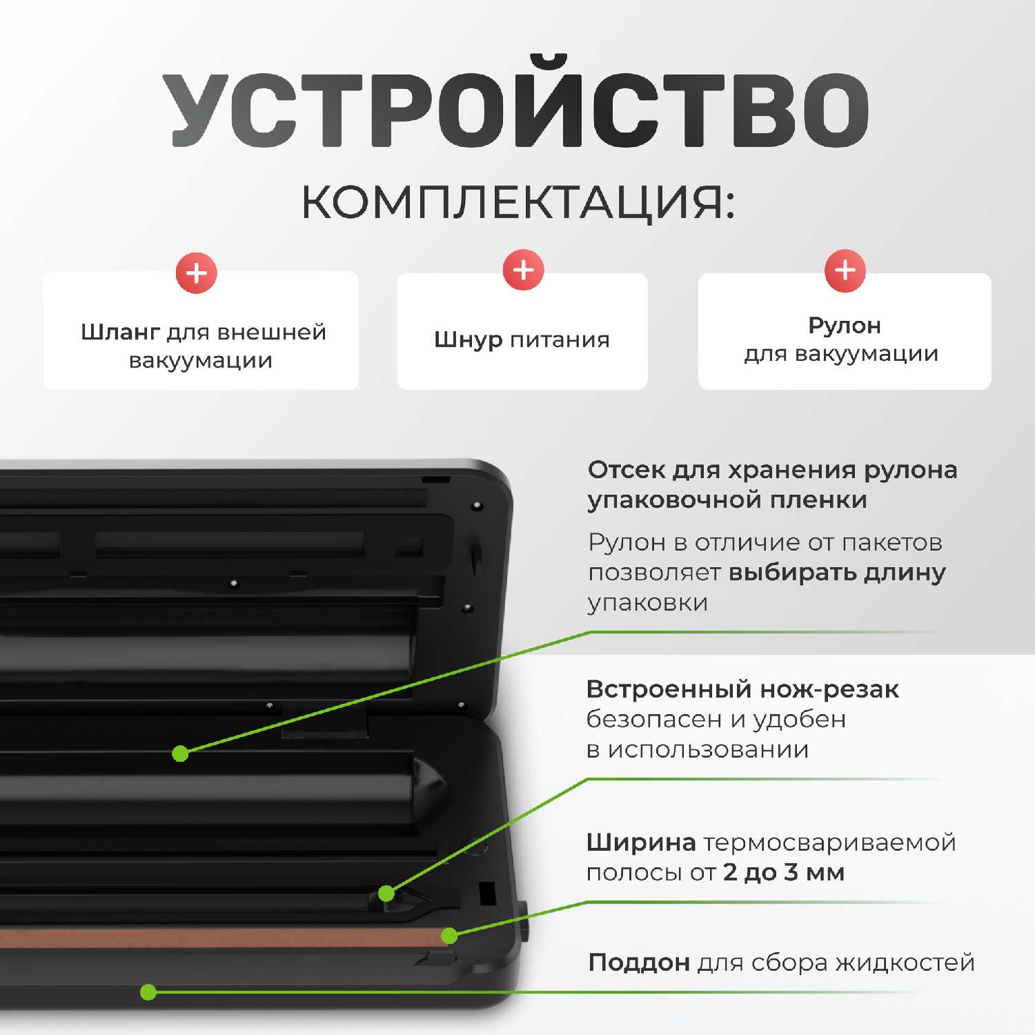 Комплектация и совместимость с расходными материалами данного вакуумного упаковщика включает рулон пакетов длиной 3 метра, которого хватает для первоначального тестирования и знакомства с устройством. Пользователи положительно оценивают наличие полной комплектации, куда входит не только основной рулон пакетов, но и трубка для работы с контейнерами и пакетами со специальным клапаном. Расходные материалы — пакеты и рулоны для упаковки — являются универсальными и доступны для приобретения на различных маркетплейсах, что обеспечивает простоту дальнейшего использования устройства. Однако существует важное ограничение по совместимости — аппарат не работает с пакетами, имеющими двустороннее теснение, что необходимо учитывать при покупке расходных материалов. Инструкция на русском языке, включенная в комплект, описывает все аспекты работы с устройством и помогает быстро разобраться с функционалом даже неопытным пользователям. Производитель предоставляет расширенную гарантию на 2 года, а при регистрации на сайте — дополнительный год гарантийного обслуживания, что повышает уверенность в долговечности устройства.