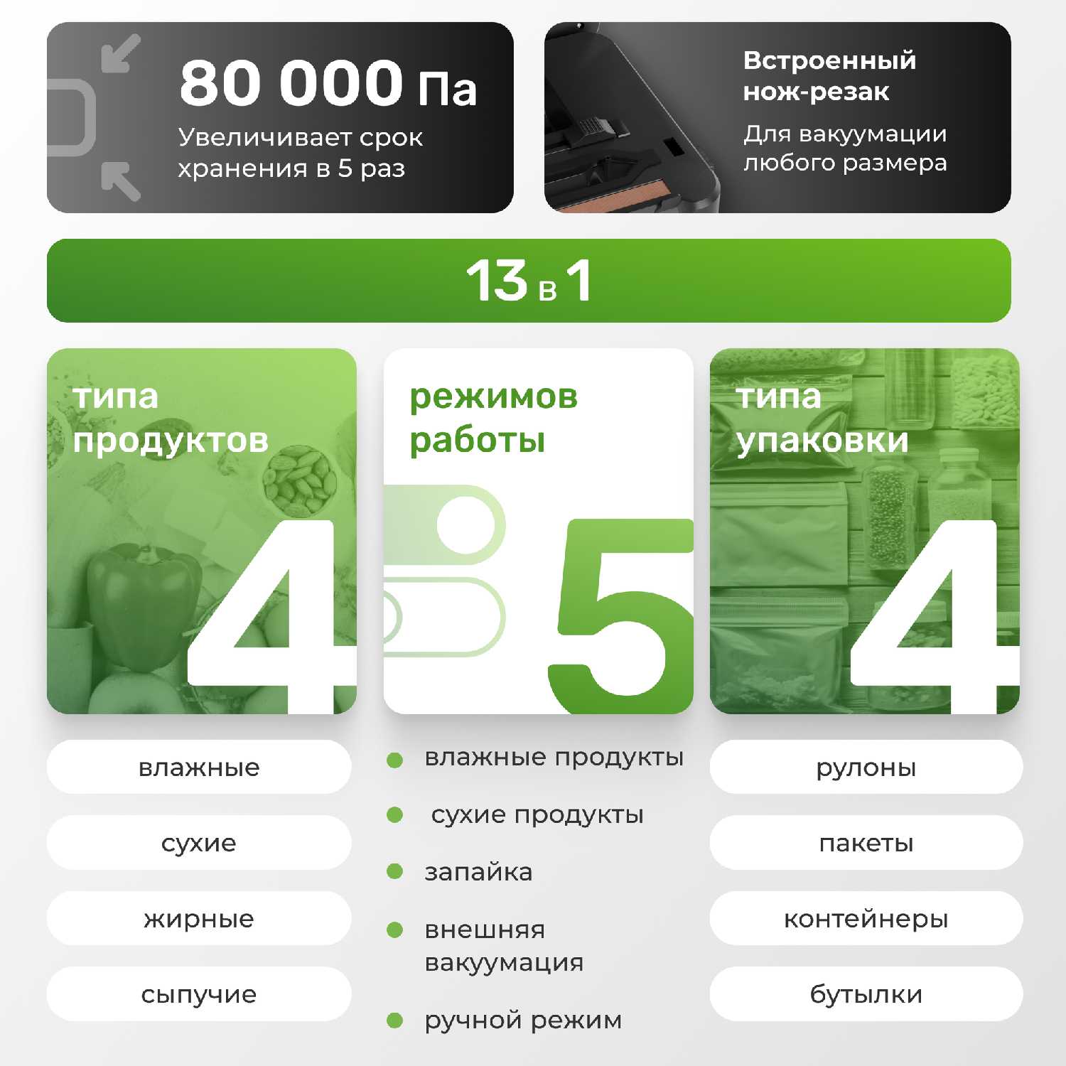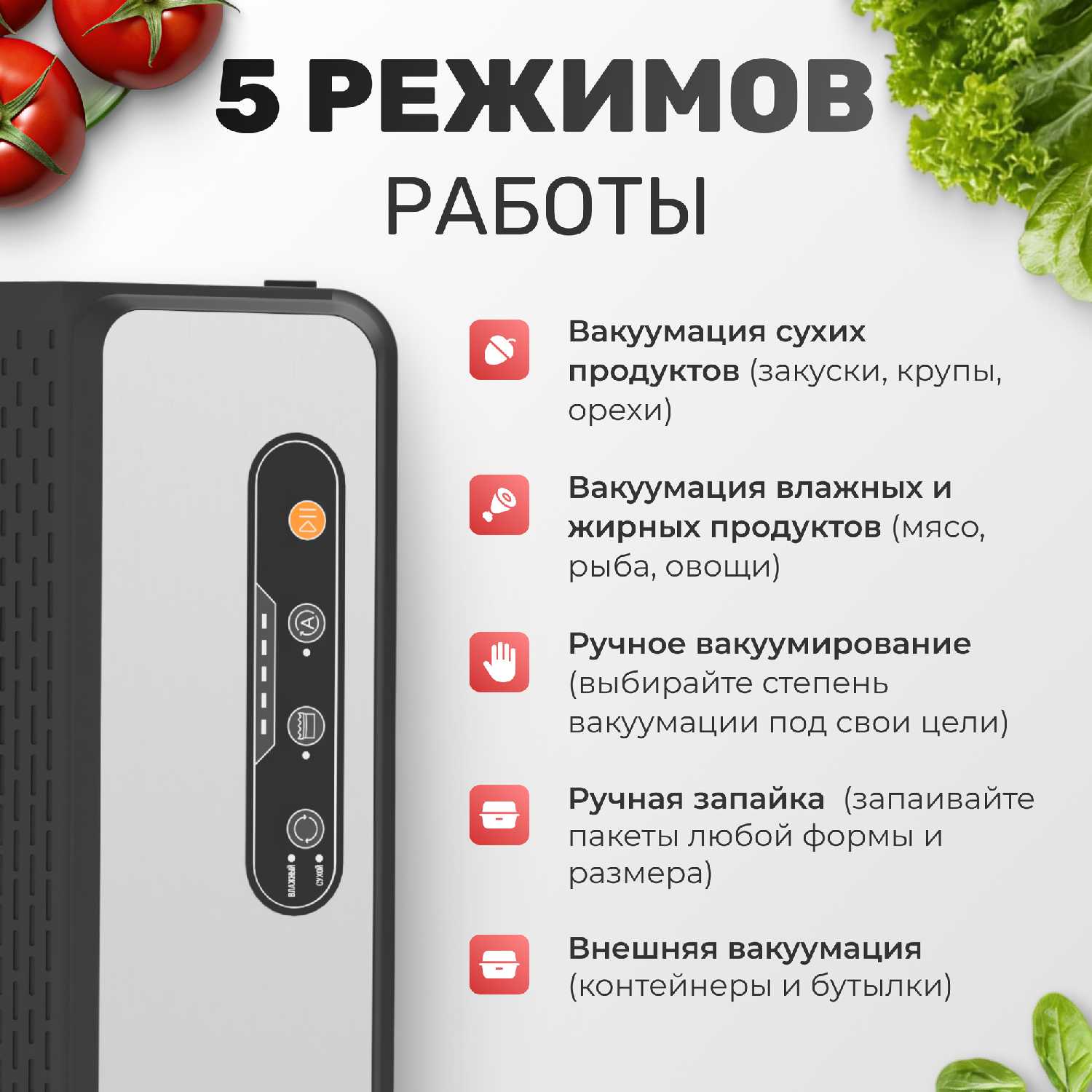 Прибор поддерживает как автоматический, так и ручной режим работы, что позволяет гибко настраивать процесс под разные типы продуктов. Производитель предусмотрел отдельные режимы для упаковки сухих продуктов и продуктов с повышенной влажностью. Переключение между режимами осуществляется легко и не требует специальных знаний. -