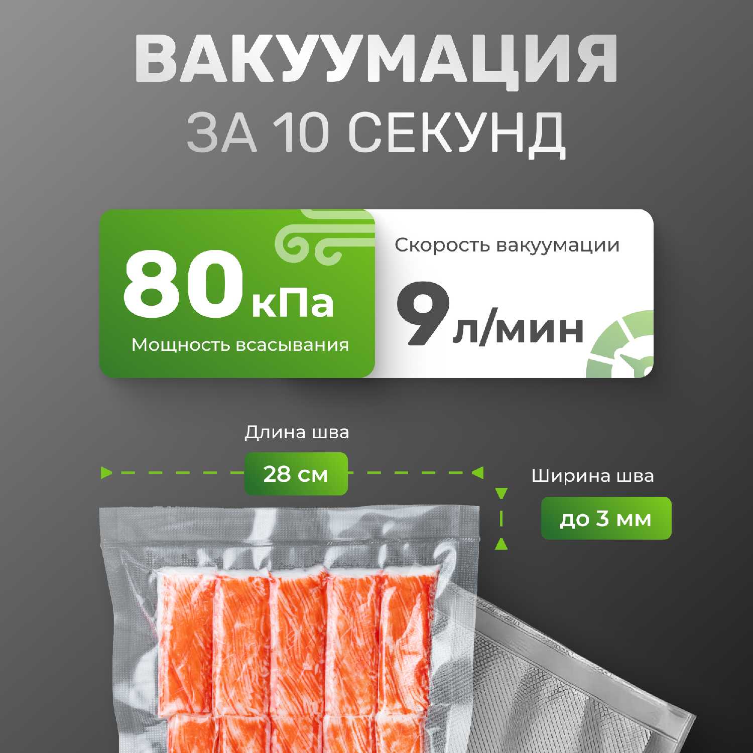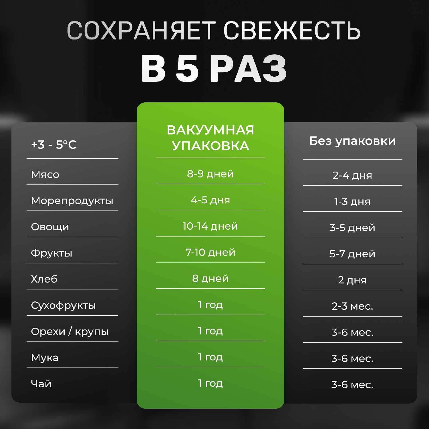 Процесс полной упаковки, включая откачку воздуха и запайку шва, занимает в среднем 10-15 секунд. Благодаря такой скорости использования прибор не задерживает процесс приготовления или подготовки продуктов к хранению. Пользователи отмечают, что за считанные секунды объем пакета с продуктом значительно уменьшается, что экономит место в морозильной камере. -