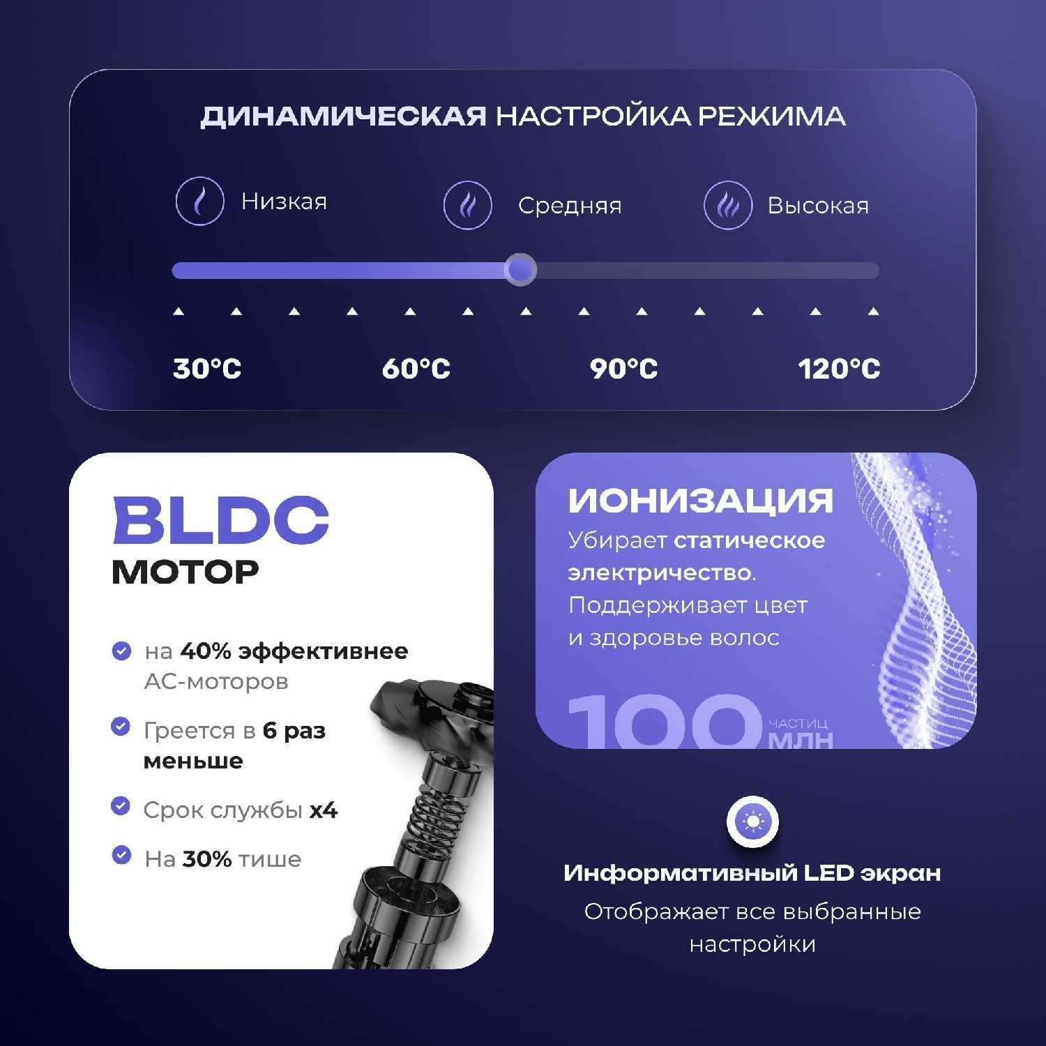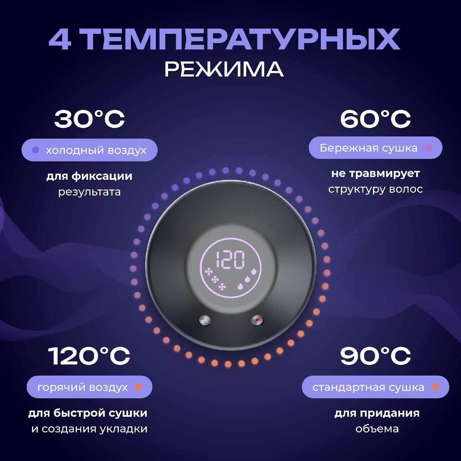 Фен оснащен тремя скоростями обдува и четырьмя температурными режимами, включая функцию холодного воздуха. Управление реализовано через кнопки, расположенные рядом с дисплеем, что предотвращает случайное переключение режимов. Система запоминает выбранные настройки и восстанавливает их при повторном включении. Пользователи особенно ценят предустановленные режимы, включая чередование температур, которые не требуют дополнительной настройки. -