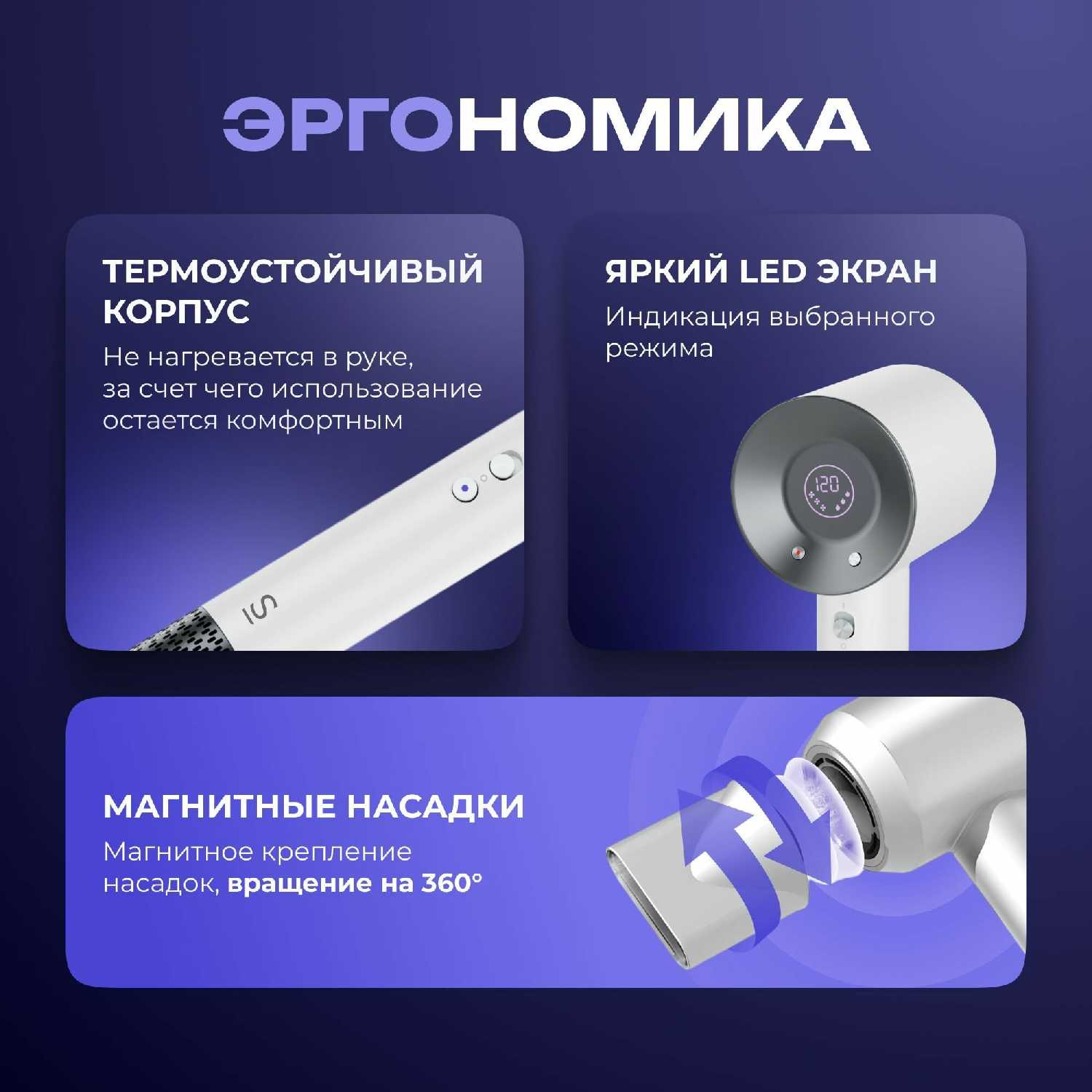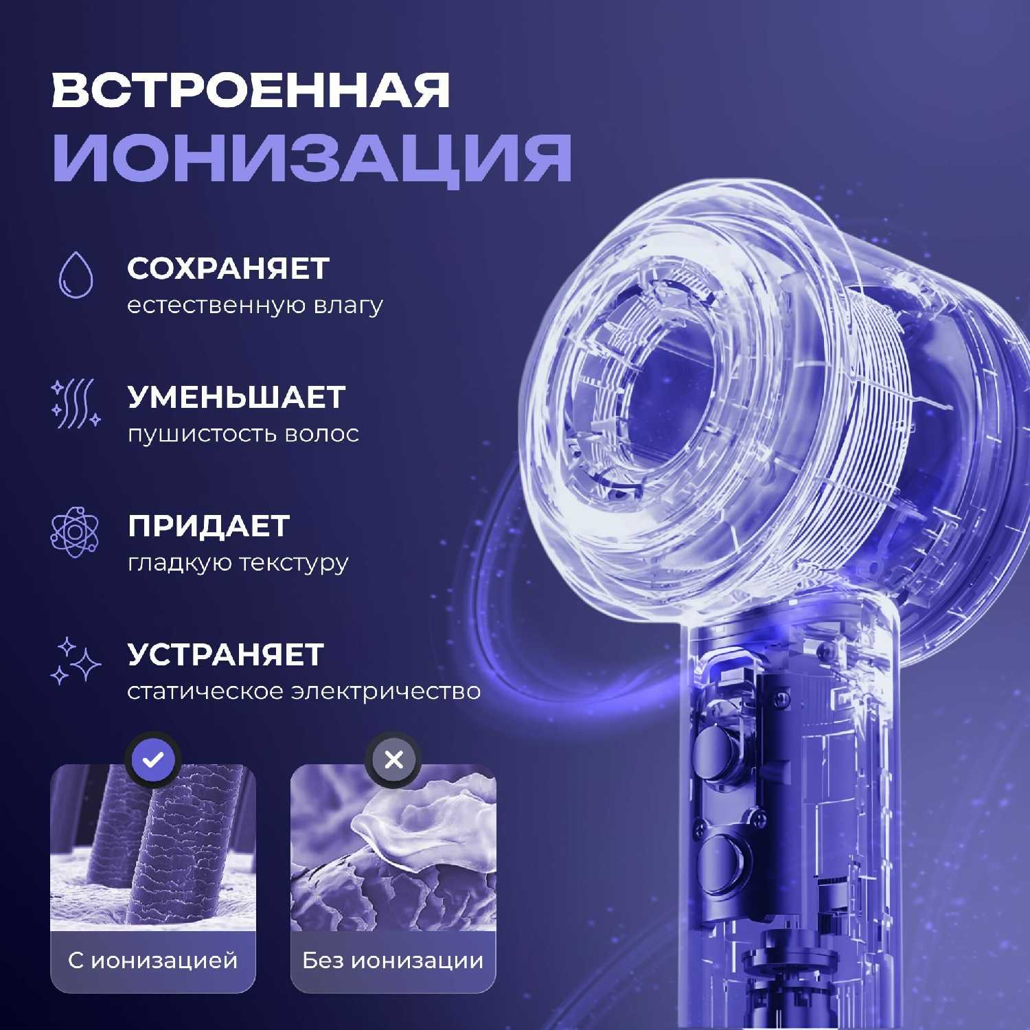 Ионизация включена по умолчанию и работает постоянно во всех режимах. Пользователи отмечают заметное уменьшение электризации волос, исчезновение эффекта "пушистости" и появление здорового блеска. Волосы после сушки остаются гладкими и уложенными, что особенно важно для обладателей непослушных и кудрявых волос. Функция не требует дополнительной активации и интегрирована в основную систему работы устройства. -