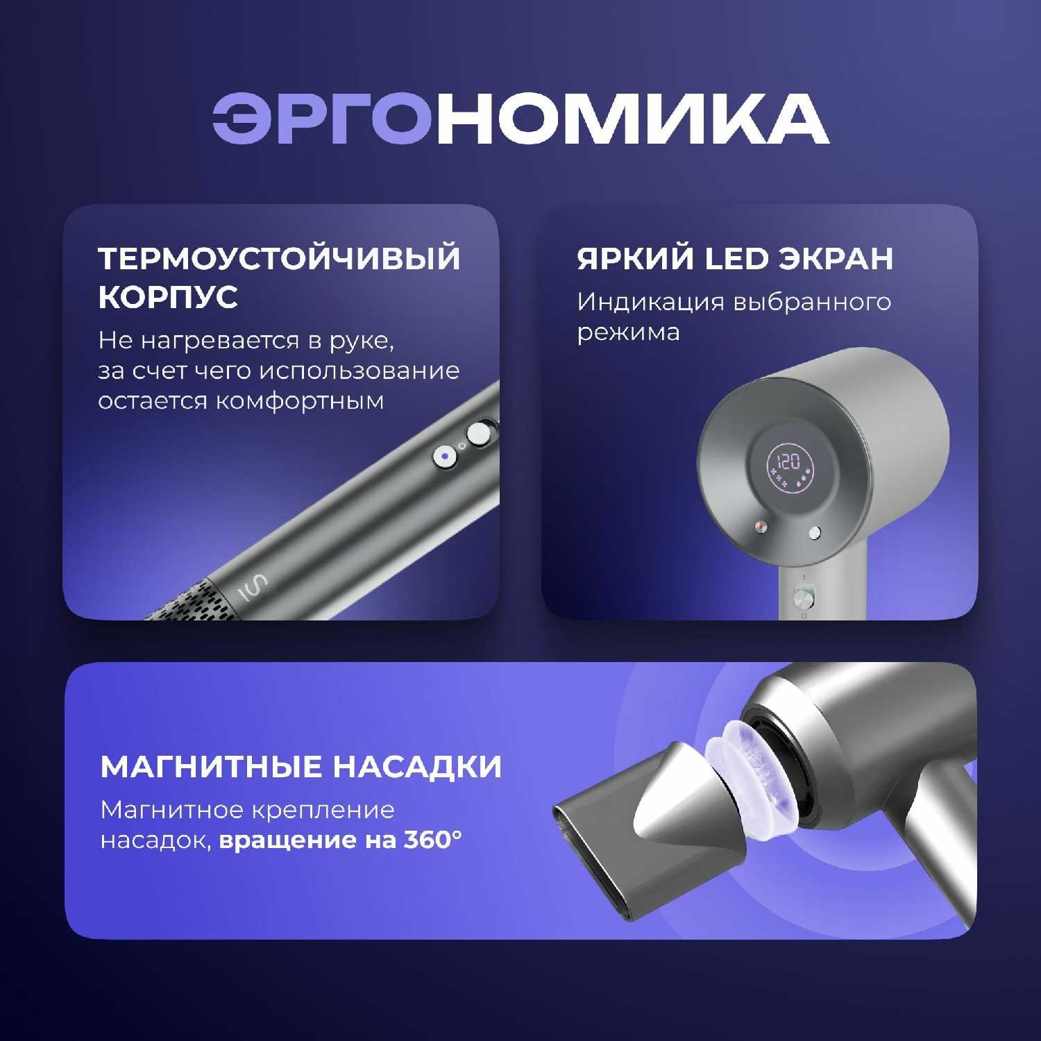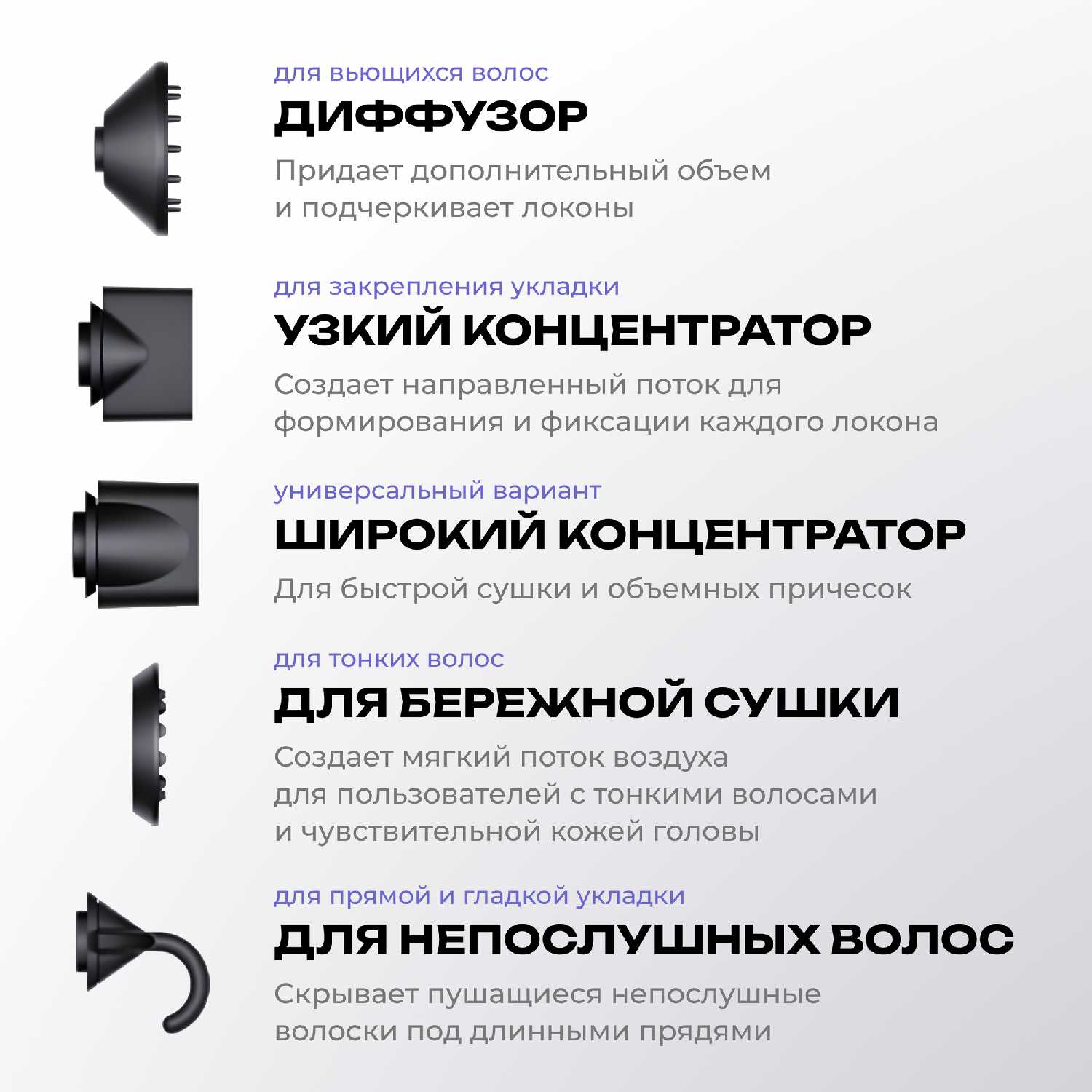 В комплектацию входят пять специализированных насадок, включая концентратор для выпрямления, диффузор для создания объемных локонов и универсальные насадки для базовой сушки. Пользователи особенно выделяют насадку для выпрямления, которая позволяет достигать эффекта, сравнимого с использованием утюжка, но без термического повреждения волос. Диффузор эффективно создает естественные волны, что оценили любители натуральных укладок. -
