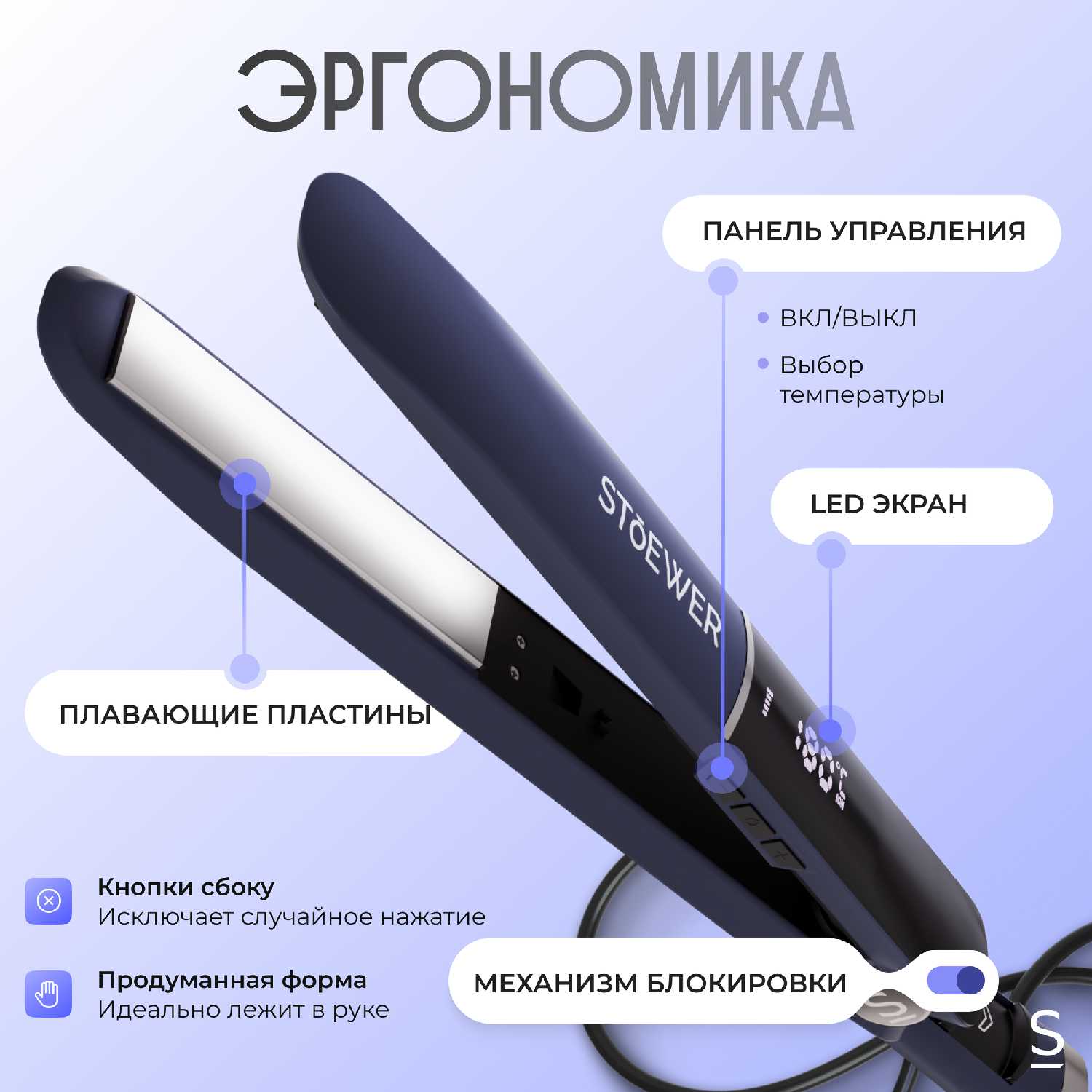 Пластины длинные и удлиненные, что позволяет захватывать больше волос за раз. Это ускоряет выпрямление густых и длинных волос. Удобно для локонов, охватывая большие пряди. Плавающие пластины обеспечивают равномерный контакт. -