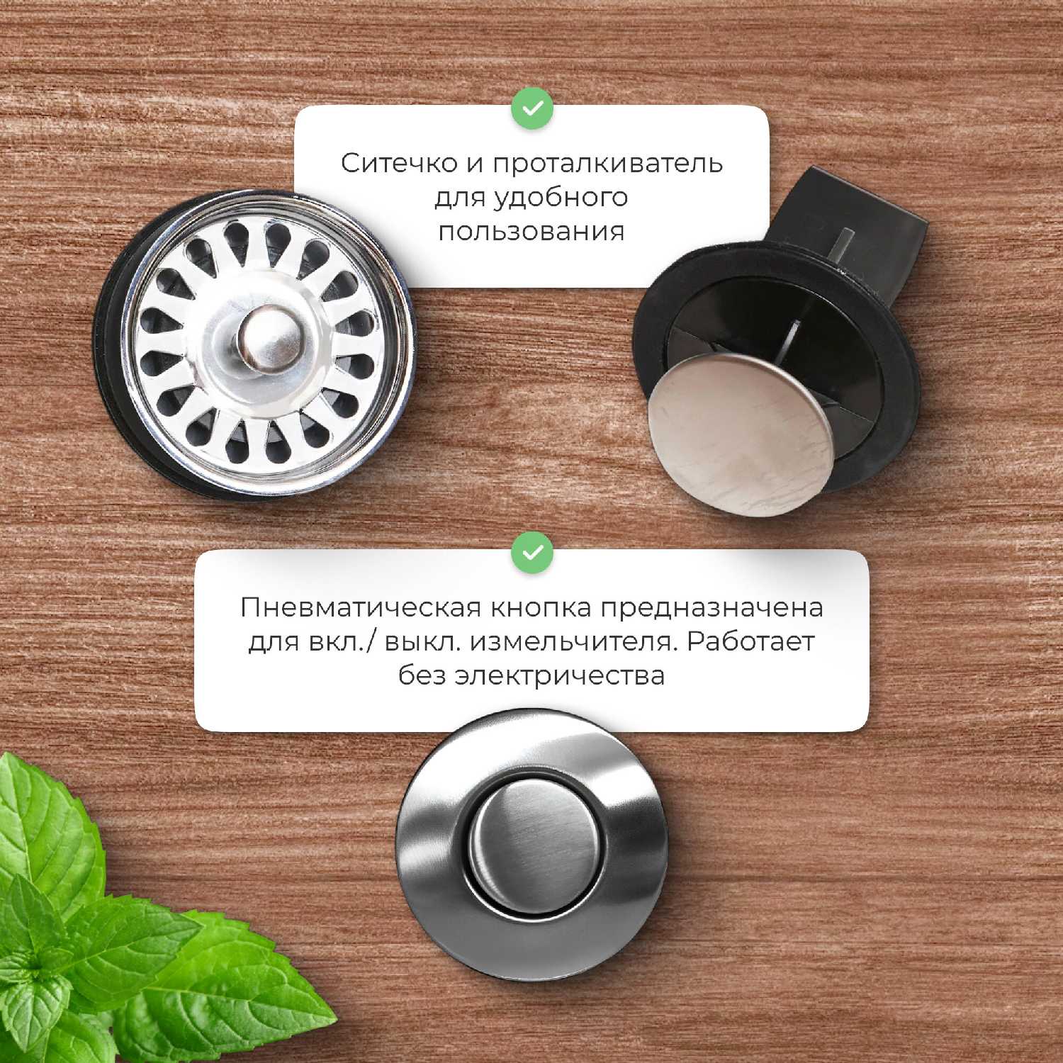 - Дистанционная кнопка активируется без проводов, позволяя размещение в любом месте под мойкой.