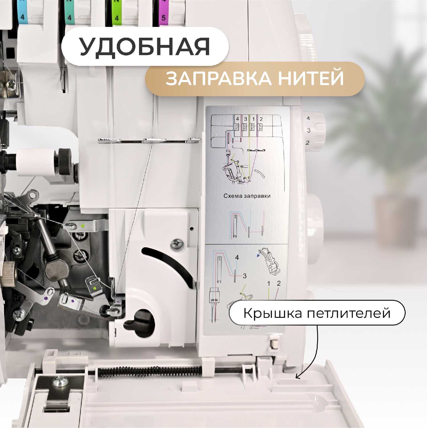 - + инструкция содержит как настроить строчку как для 4 нитки, так и для 3 нитки