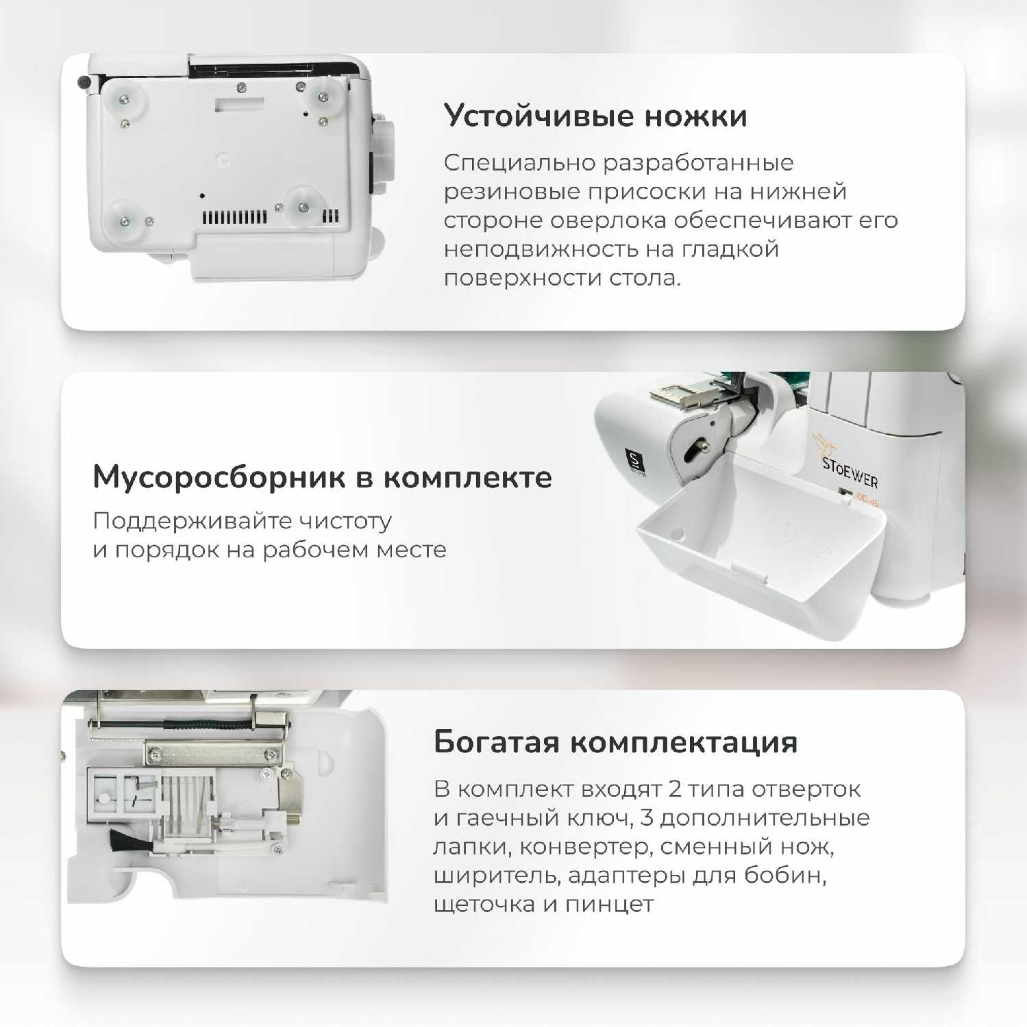 - + Прекрасный оверлок, разобралась быстро, силиконовые ножки намертво держат на столе на одном месте