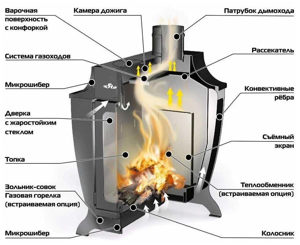 - + Быстрая отдача тепла. Берет даже сырые дрова. Подходит для женщин, тк легка в эксплуатации. Есть стекло, и можно любоваться горящим огнём. На ней можно готовить.
