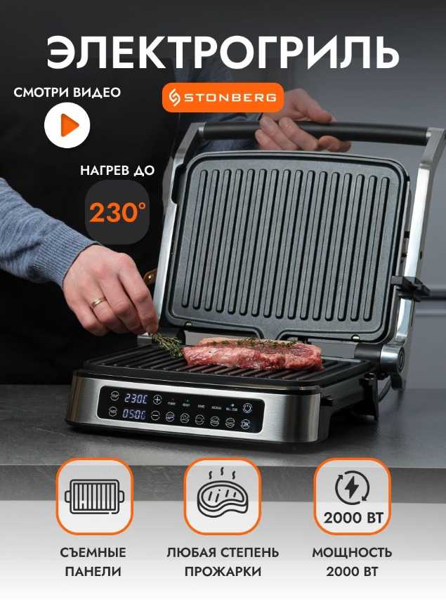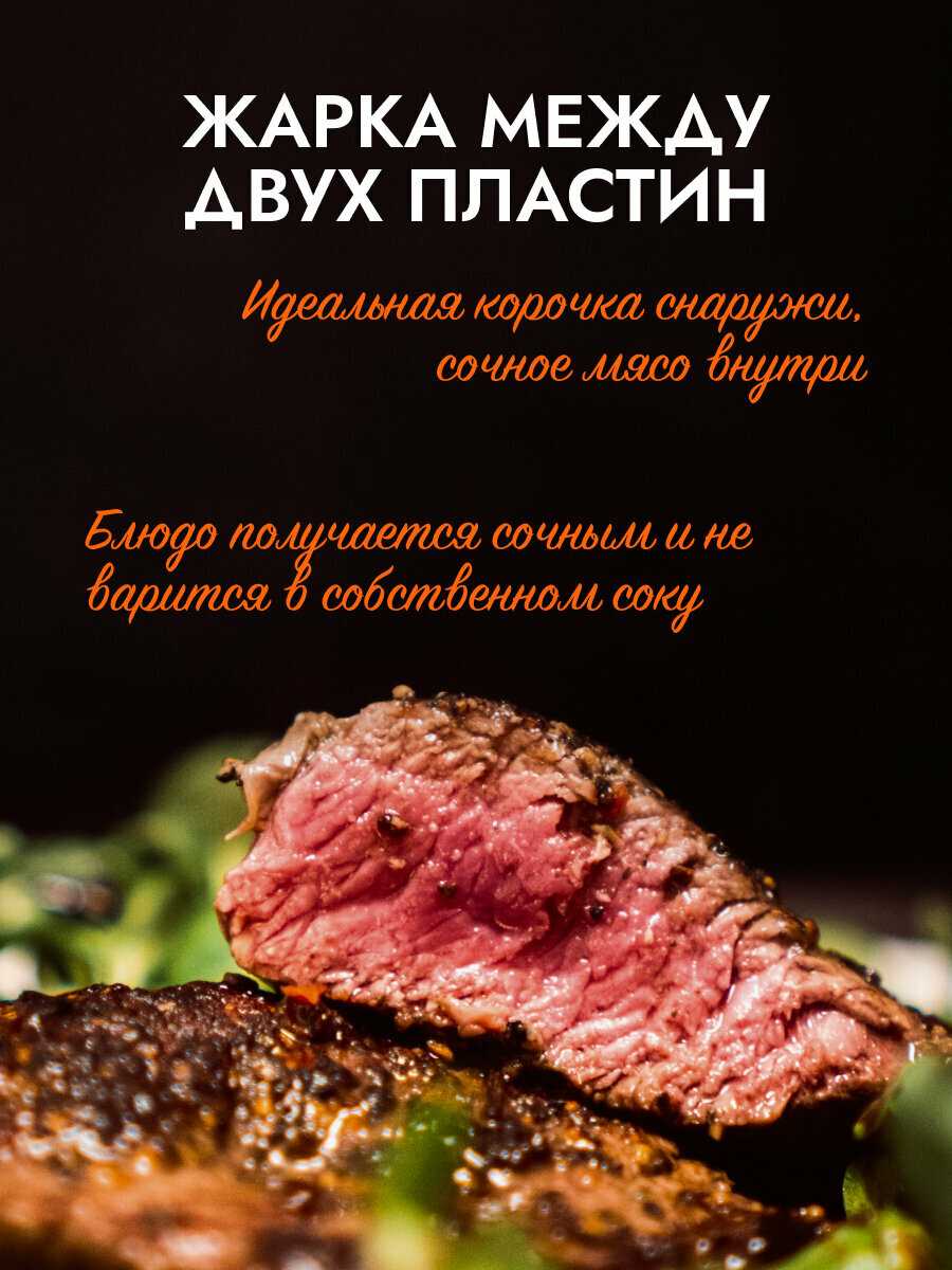 - Одновременный нагрев верхней и нижней пластин сокращает время готовки на 40% (например, 1.5 кг свинины за 10 минут).